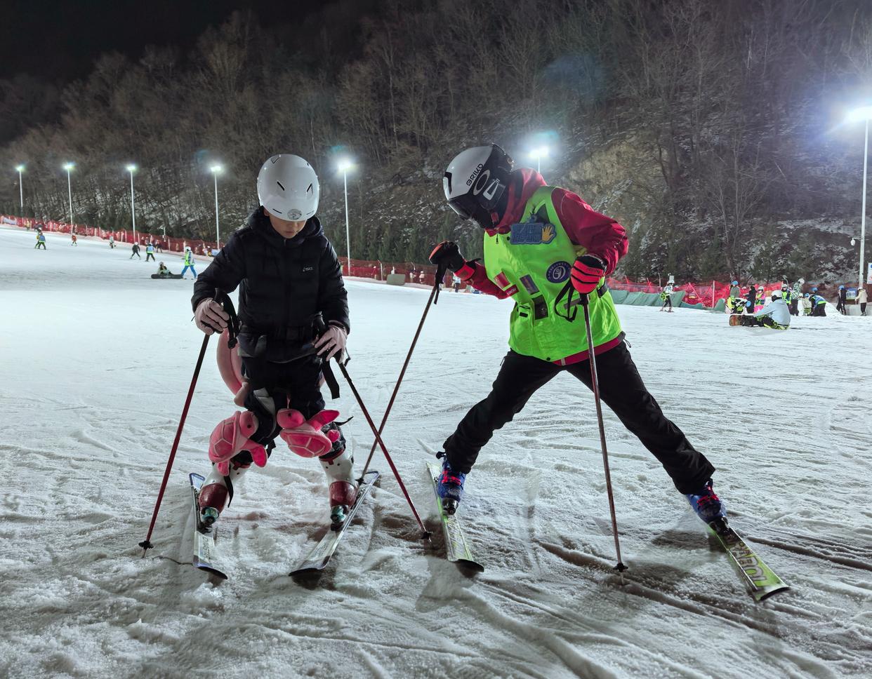 齐佳欣(右)正在为一名初学者讲授滑雪技巧。新华社记者 贺占军 摄