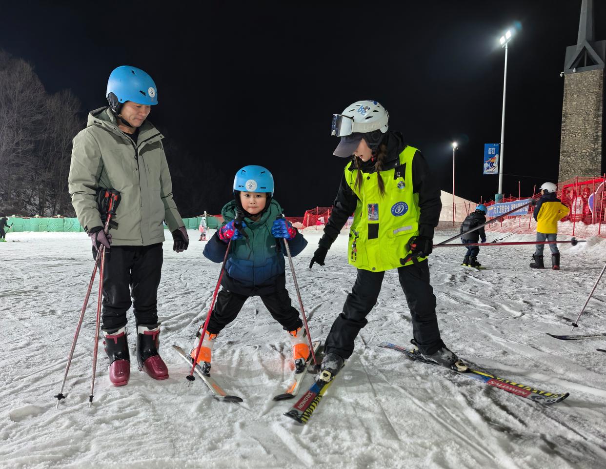 “很喜欢夜场,月光、灯光与冰雪交融,意境特别好。”刘文健说,现在滑夜场的人越来越多,很多人都是“全家总动员”来滑雪。