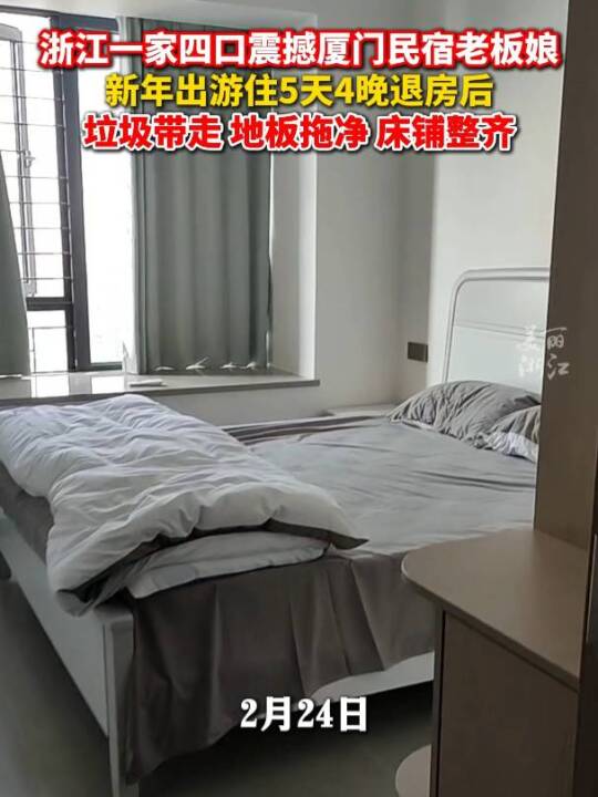据樊女士描述,这家人住了5天4晚,退房时她本来准备大搞卫生,一开门直接惊呆:房间干干净净,垃圾全扔,地拖好,连床都铺得整整齐齐,高素质拉满!