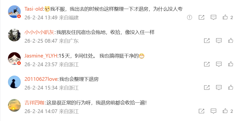 “我一直觉得民宿退房后,卫生都是由我们自己来收拾的。以为会是一片狼藉,可是当我打开门的那一刻,我真的被震惊到了。”