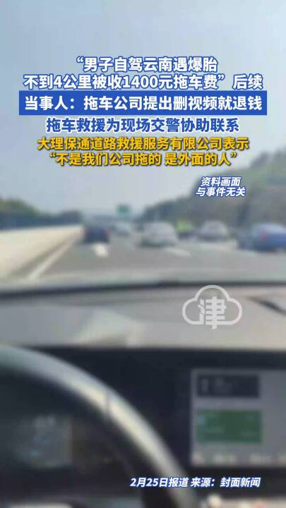 近日,一位广东网友在社交平台反映,自己从广东潮汕自驾前往云南途中,在大理高速公路上车辆突然爆胎。现场交警协助联系了拖车救援,可拖车仅行驶不到4公里抵达收费站,对方竟报价1500元,经协商后最终收取了1400元。当事人陈先生表示,目前涉事拖车公司已联系他,提出删除相关视频即可退款。但其并未接受,他希望相关部门介入调查、依法处罚。