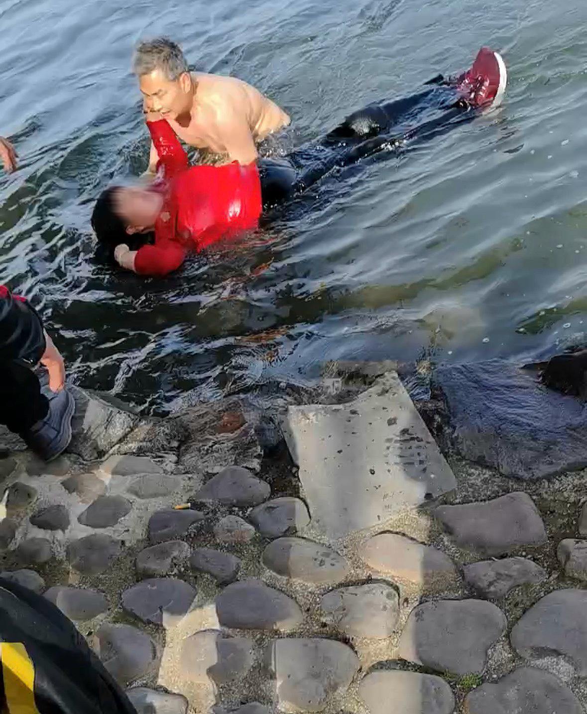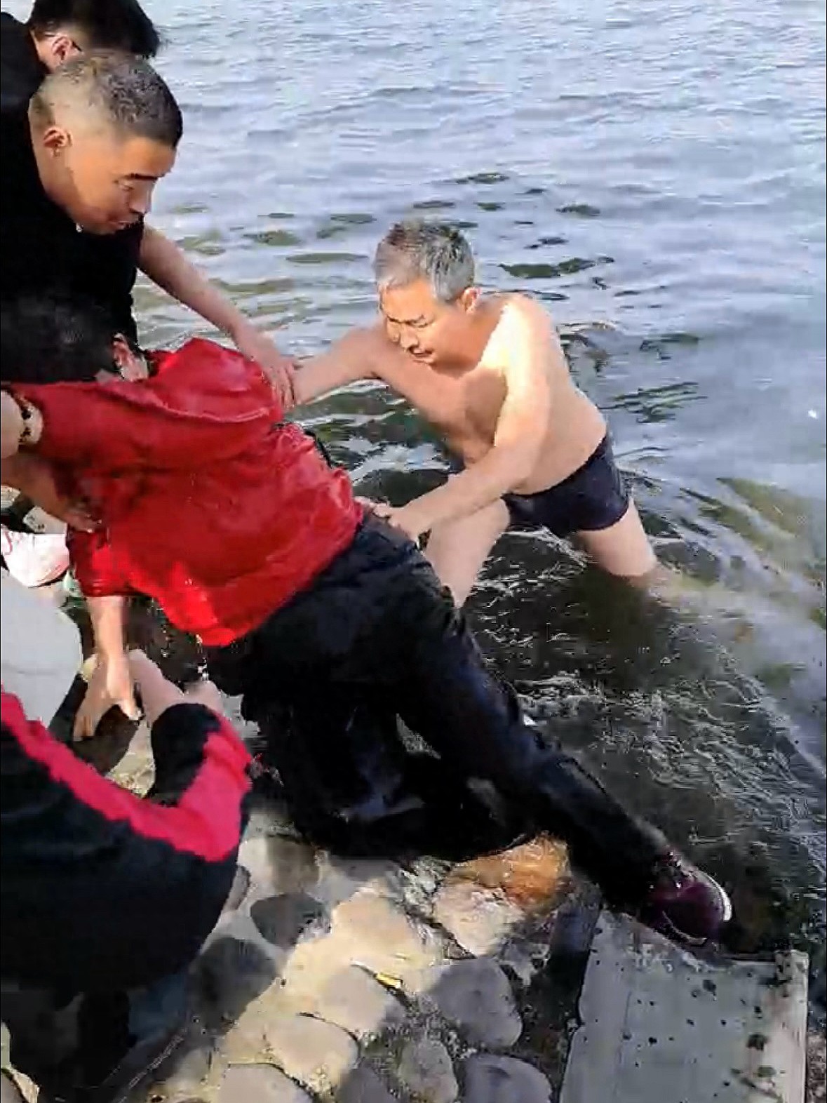 上岸后,那位救人的中年男子浑身湿透,顾不上寒冷,只是简单擦了擦身子,便和家人默默离开了现场,连名字都没留下。