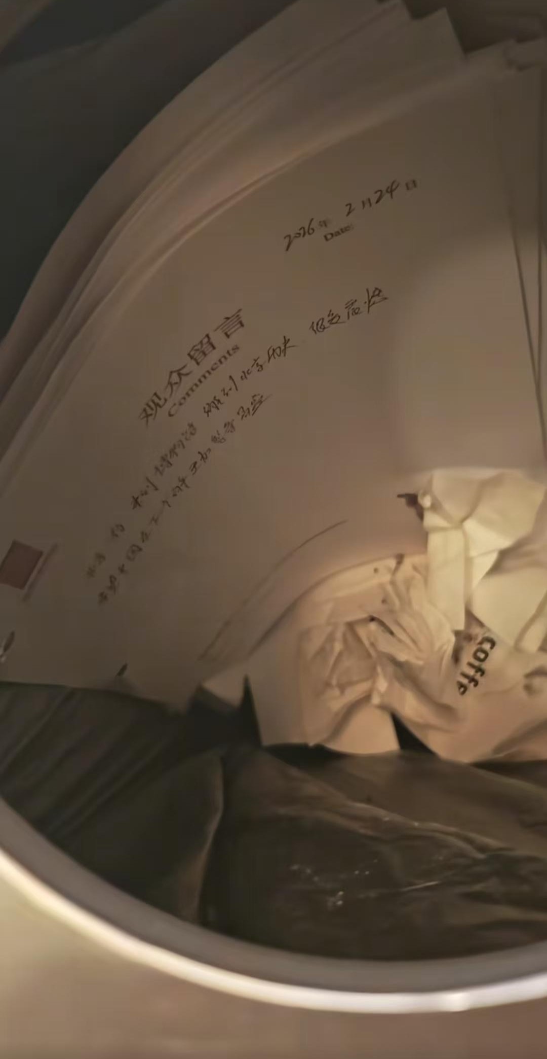 据网友提供的视频中显示,在一个不锈钢的垃圾桶里,一沓写有“观众留言”的纸被丢在里面,上面能清晰看到“2026年2月24日”的字样,网友感慨“这观众留言就这么被扔了”。