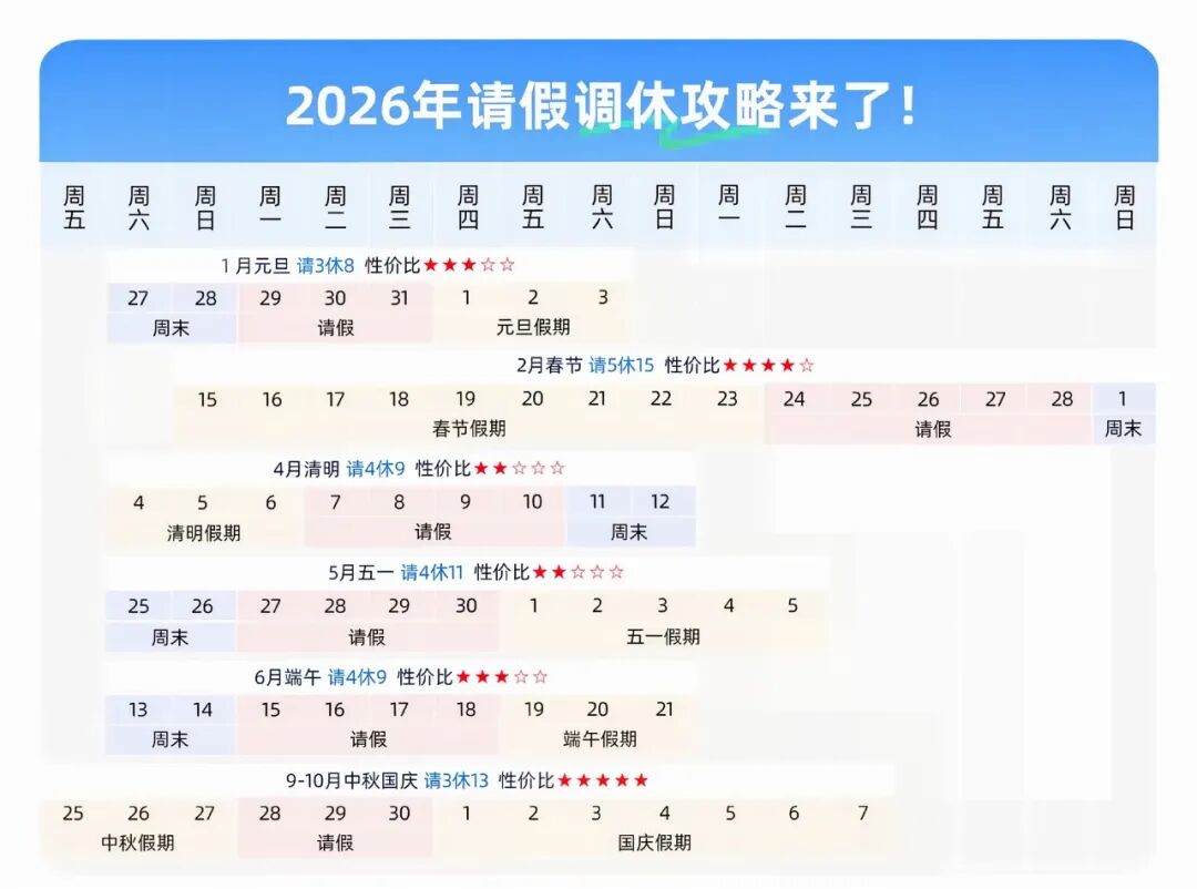 2026年中秋节是9月25日(周五)至27日(周日),共3天;国庆节是10月1日(周四)至7日(周三),共7天。中间的9月28日、29日、30日,恰好是三个工作日。