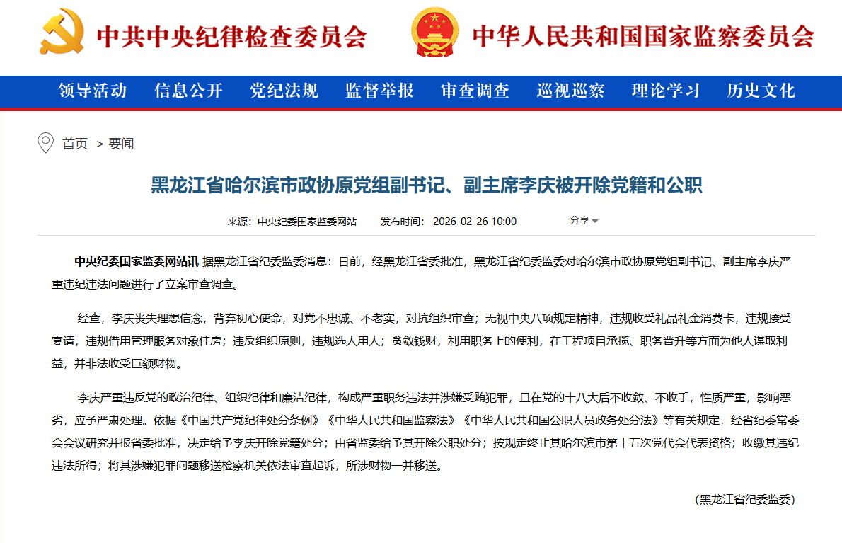 中央纪委国家监委网站讯 据黑龙江省纪委监委消息:日前,经黑龙江省委批准,黑龙江省纪委监委对哈尔滨市政协原党组副书记、副主席李庆严重违纪违法问题进行了立案审查调查。