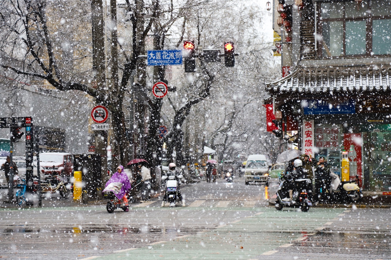 ▲上图:新春伊始,我国部分地区出现降雪天气。图为2月23日,在陕西省西安市街头,市民冒雪出行。新华社发(薛刚摄)