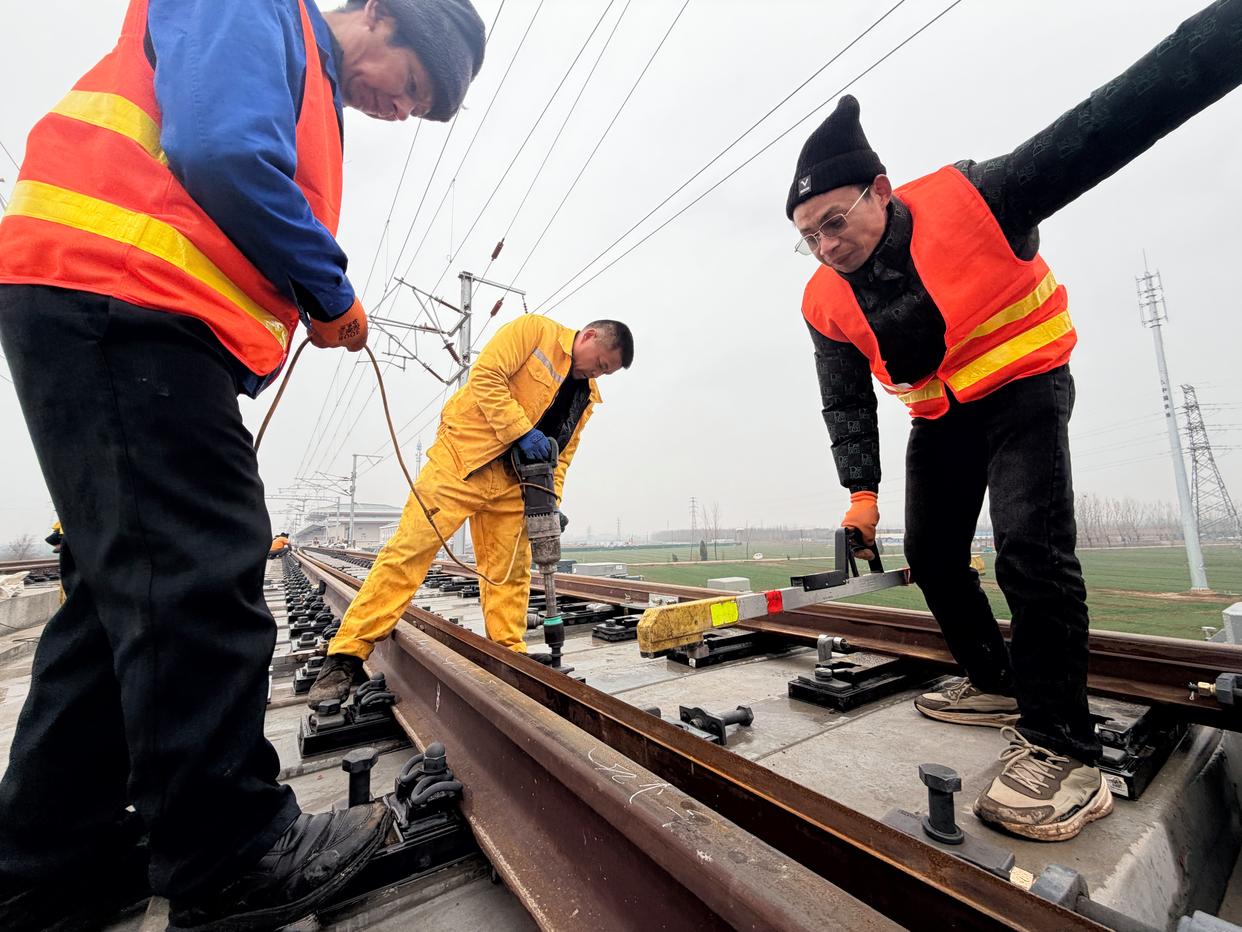 2月26日,在雄商高铁聊城至菏泽区段静态测试现场,工人们正进行精调精修作业。新华社记者 张钟仁 摄