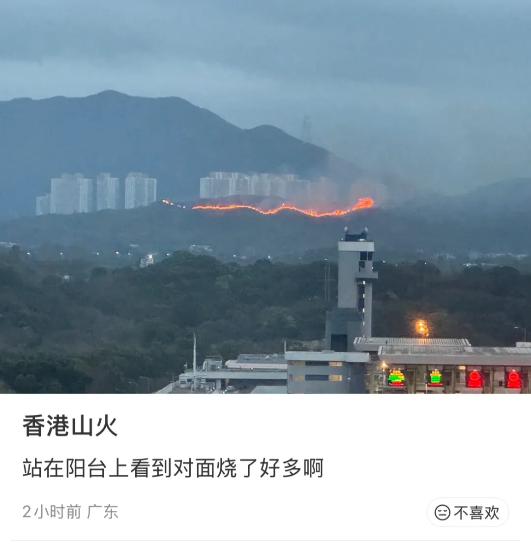多个市民发布在社交平台的视频显示,从莲塘口岸、文锦渡口岸附近望去,连绵的山火熊熊燃烧,形成一圈火线,并伴有浓烟。长达数小时的山火引发市民担忧,截至发稿,山火仍未完全扑灭。