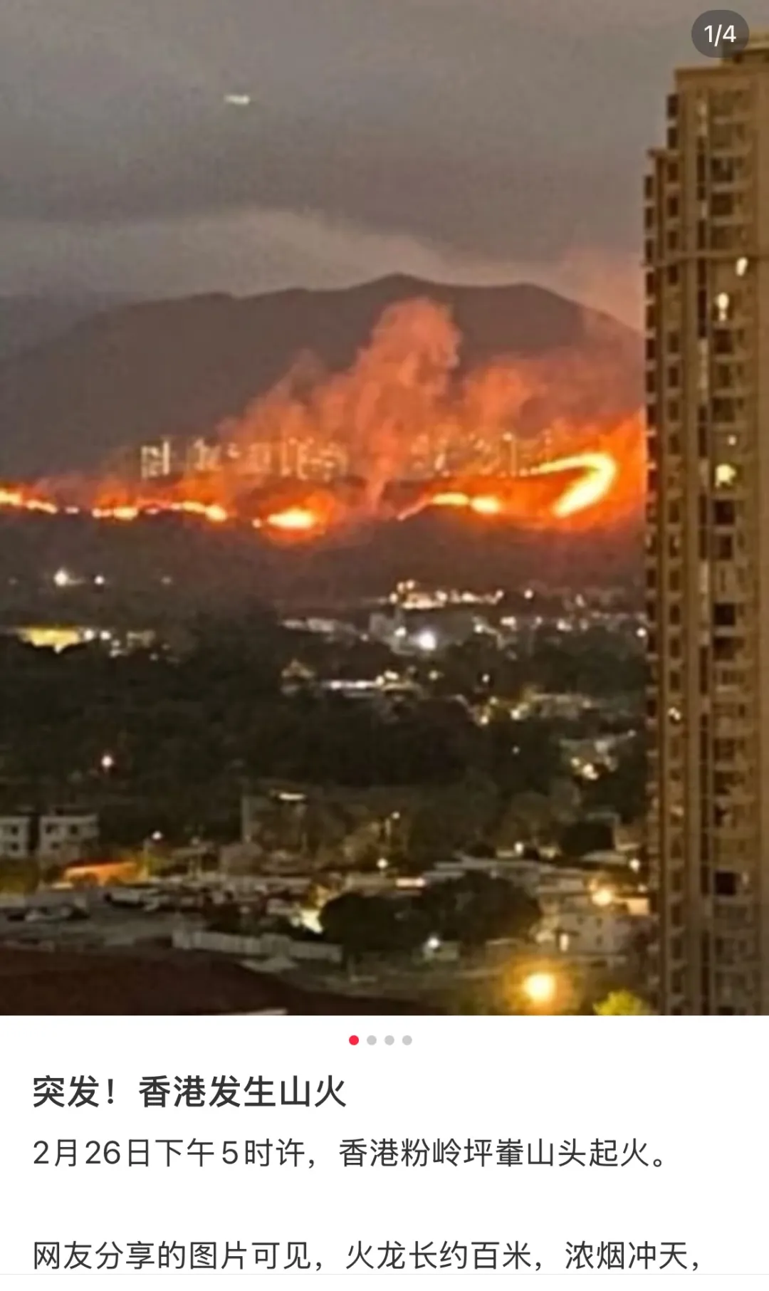 2月26日晚,多名深圳市民发布视频称,香港发生山火。火势连绵上百米,已经燃烧数小时,深圳多处可见。26日晚20时30分许,香港消防处上水消防局工作人员告诉深圳特区报&读特记者,起火的山头位于香港新界北区粉岭的军地北村附近,目前消防局仍在尽力扑救。虽然火势较大,但距离民居有一定距离,对市民来说仍比较安全。