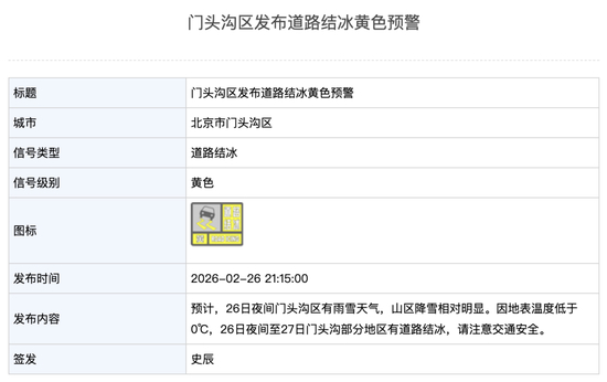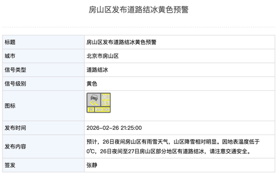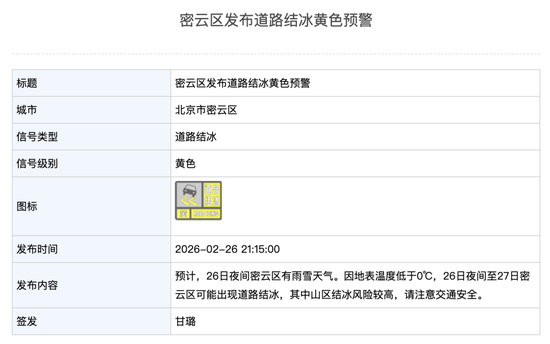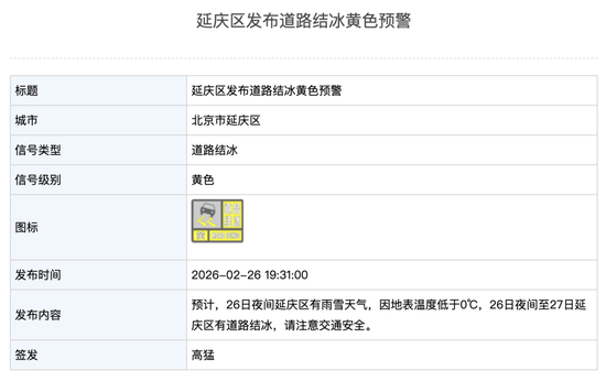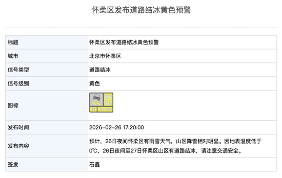 截至目前,怀柔区、延庆区、昌平区、门头沟区、密云区、房山区气象台发布道路结冰黄色预警信号。