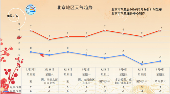 北京市气象台2月26日20时发布:今天夜间阴有雨夹雪或雪(山区小到中雪),偏南风一二级,最低气温-1℃;明天白天阴转多云,偏南风二三级,最高气温7℃。今天夜间自西向东有雨雪天气,西部山区较明显,出行请注意交通安全。