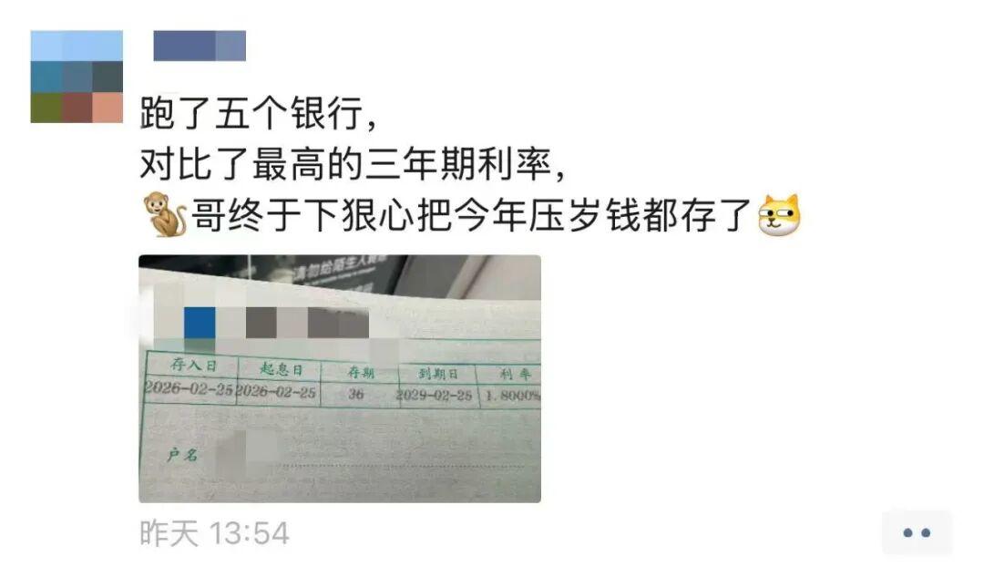 “跑了五家个银行,对比了最高的三年期利率,儿子终于下狠心把今年的压岁钱都存了。”一位儿子上小学五年级的妈妈在朋友圈晒出了儿子的存单。