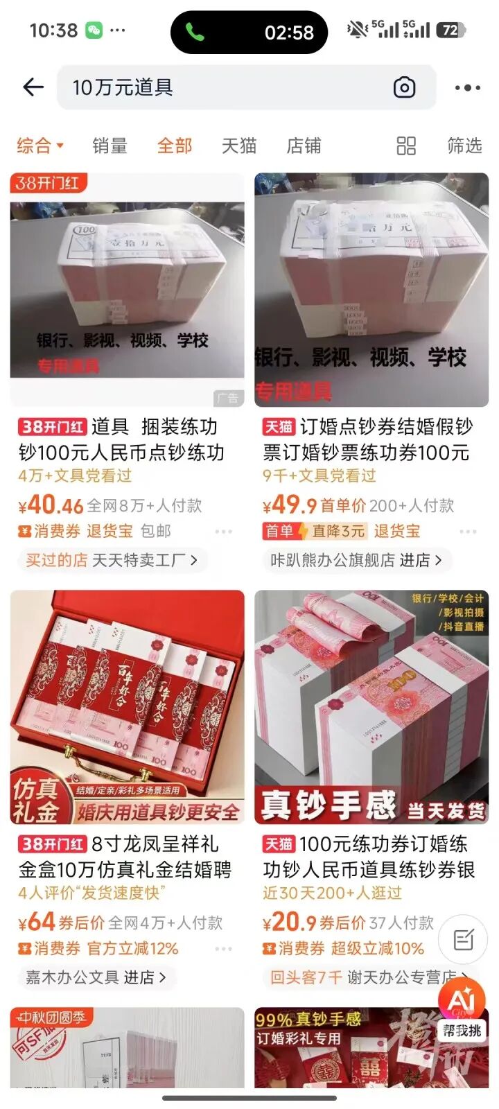 随后,姚越操在网购平台搜索“10万元道具”,出现了一批价值20-60元不等的人民币道具,他发现,有一家的道具实拍图上面也有封签和红章,“就连盖的工作人员的姓名章和行李箱里的也一模一样。”