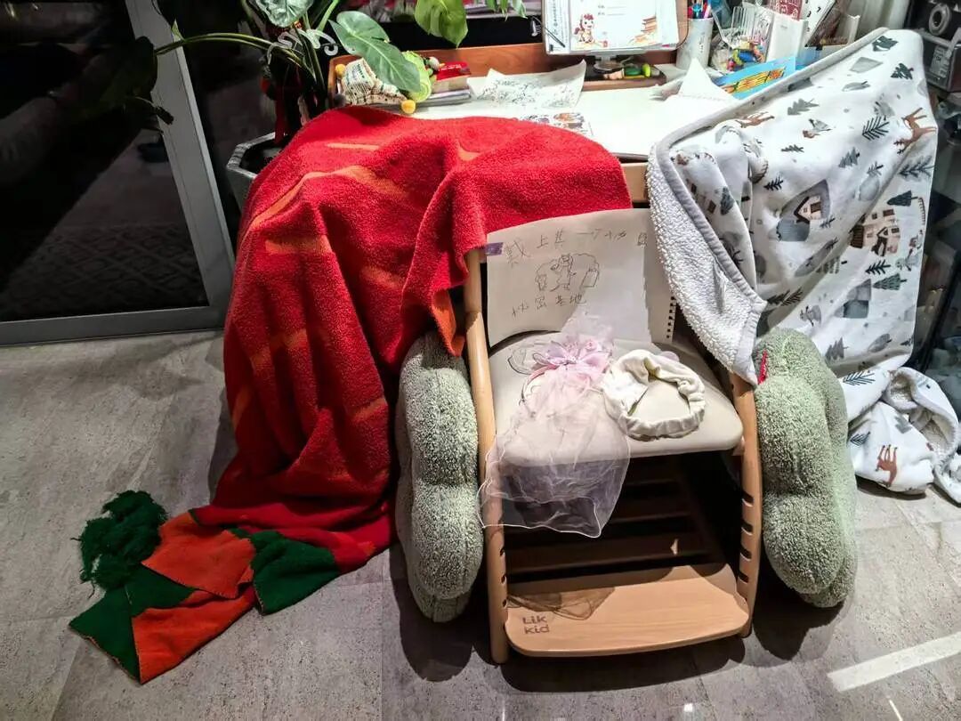 而在客厅一角,原本整齐的一张书桌被改造成了“安全屋”。悠悠用两块大毯子搭起一个帐篷,里面铺着靠垫,塞满了零食,一把椅子算入口,椅背上贴着一张白纸,手写告示:“秘密基地,戴上其一可入内”,椅子坐垫上放着几个发箍。
