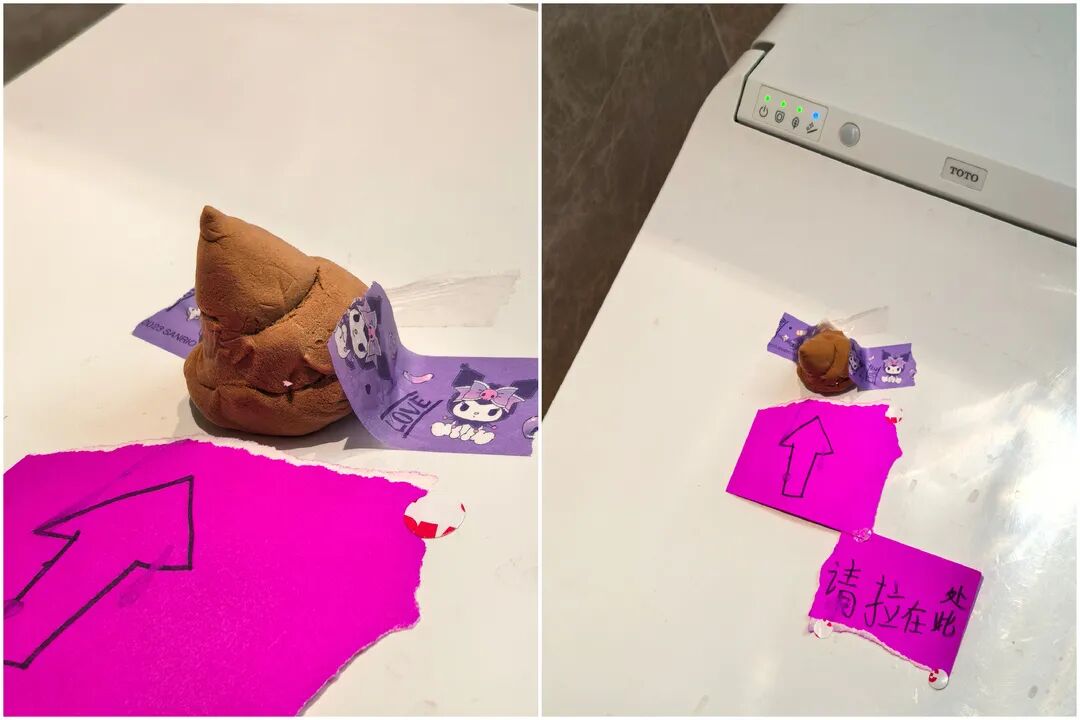 妈妈陈女士推门进去,一眼看到马桶盖上,端端正正摆着一坨用黄色橡皮泥捏的“便便”,旁边还贴着一张纸,纸上歪歪扭扭写着:“请拉在此处”。