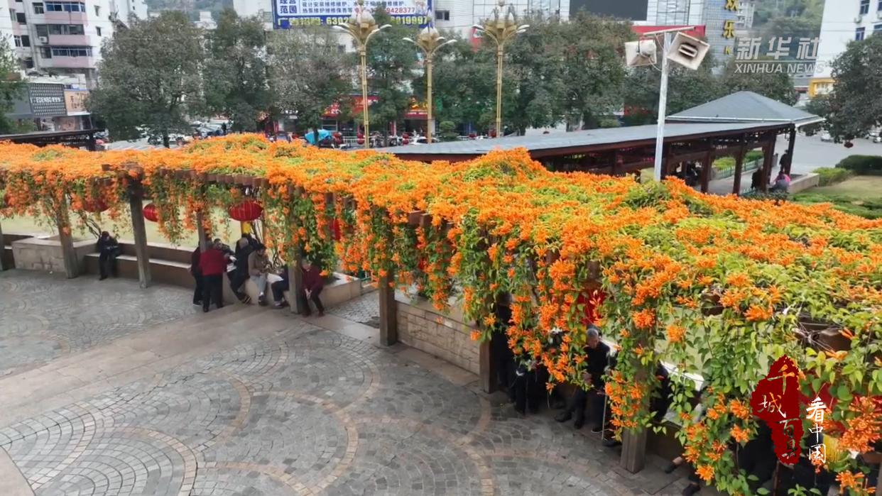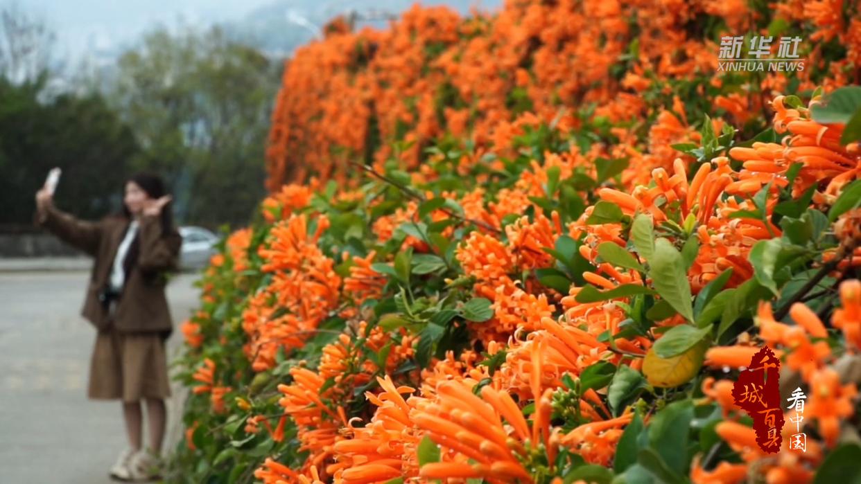 春回大地,在福建省三明市尤溪县的街头巷尾,炮仗花热烈绽放。一串串橙红色花朵如鞭炮般挂满墙头檐角,为县城增添喜庆气息。