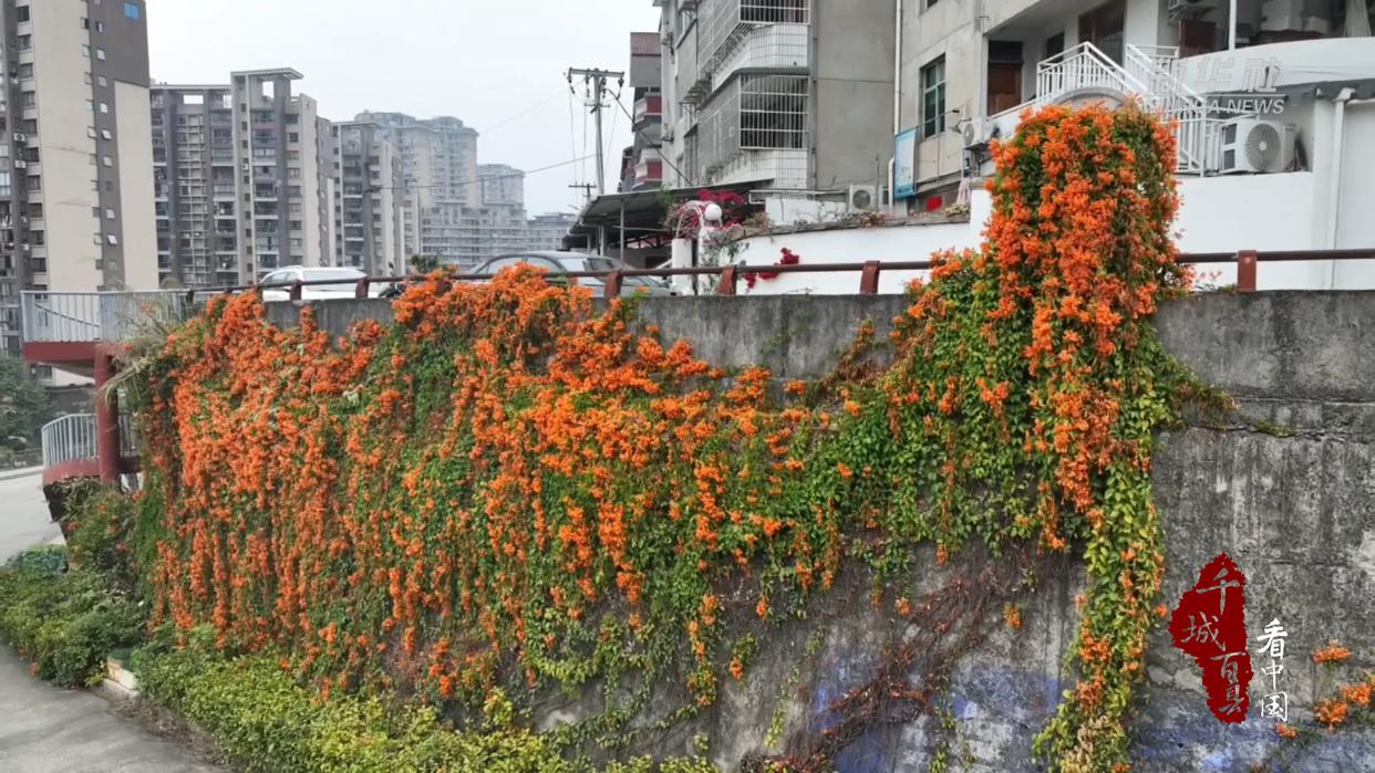 沿河步道、居民楼院墙边,繁茂藤蔓铺展延伸,橙红花朵成串垂挂,密密匝匝。花瓣如绸,色泽艳丽,仿佛为墙面披上橙红流霞。微风拂过,花串轻摇,层层叠叠与绿树碧水相映成趣,构成一幅色彩明快的城市春景图。