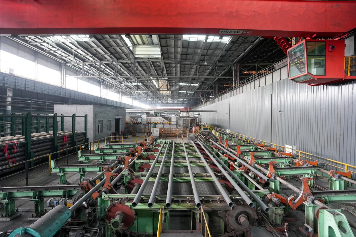 2月27日,黑龙江建龙钢铁有限公司轧钢厂钢管深加工车间自动化设备在生产作业。新华社记者 王松 摄