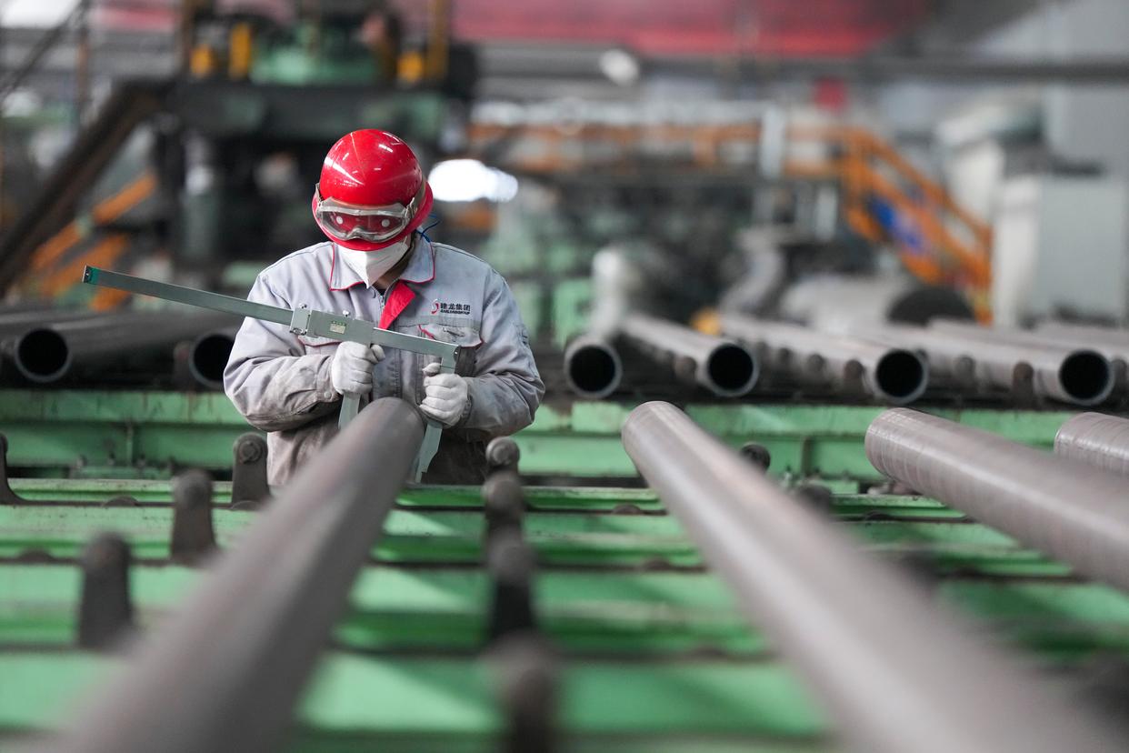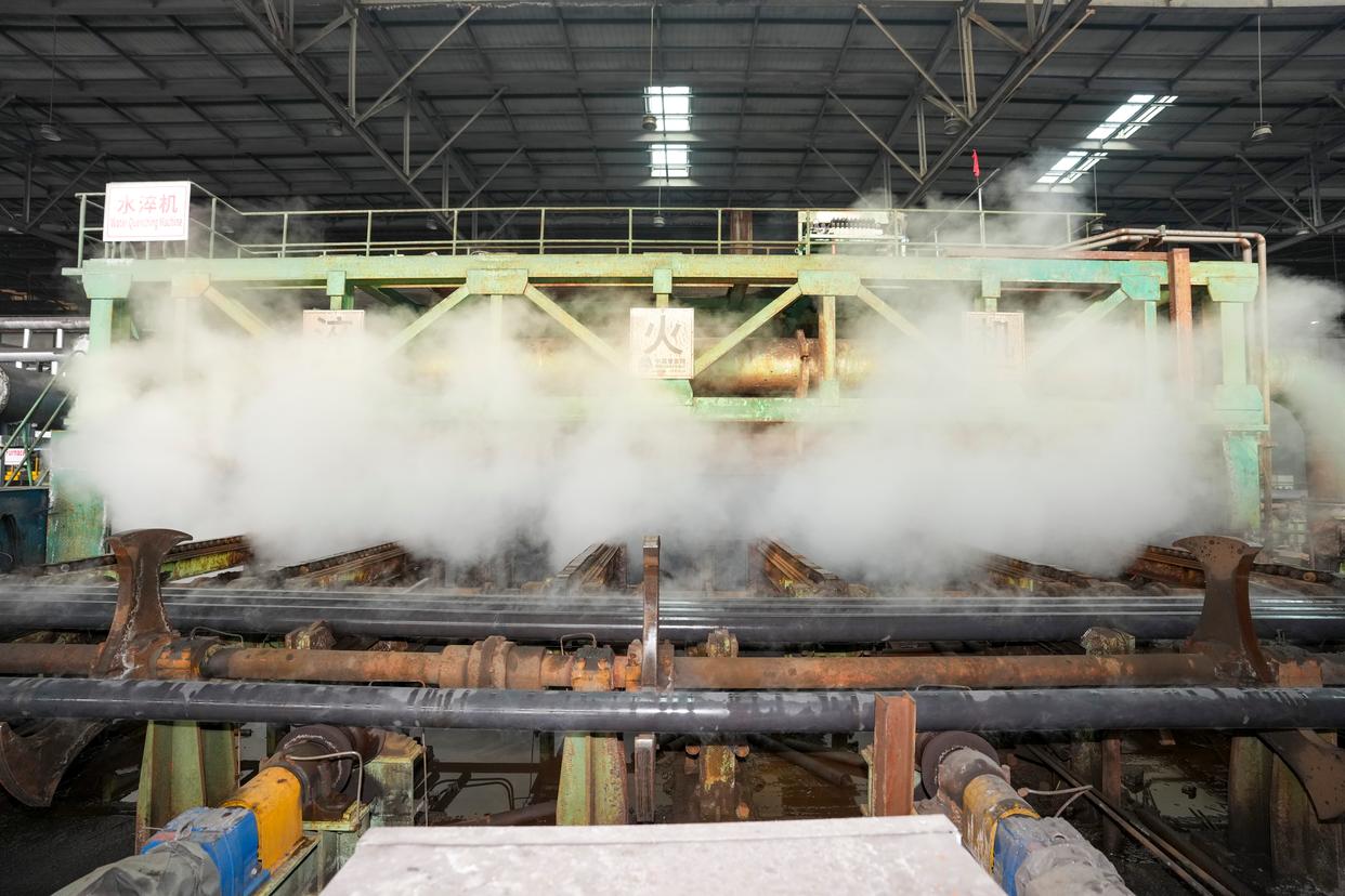 2月27日,黑龙江建龙钢铁有限公司轧钢厂钢管深加工车间质检人员对无缝钢管进行抽检。新华社记者 王松 摄