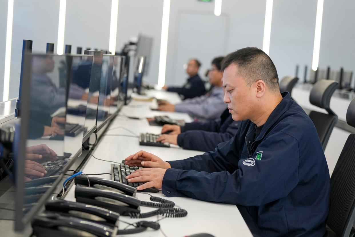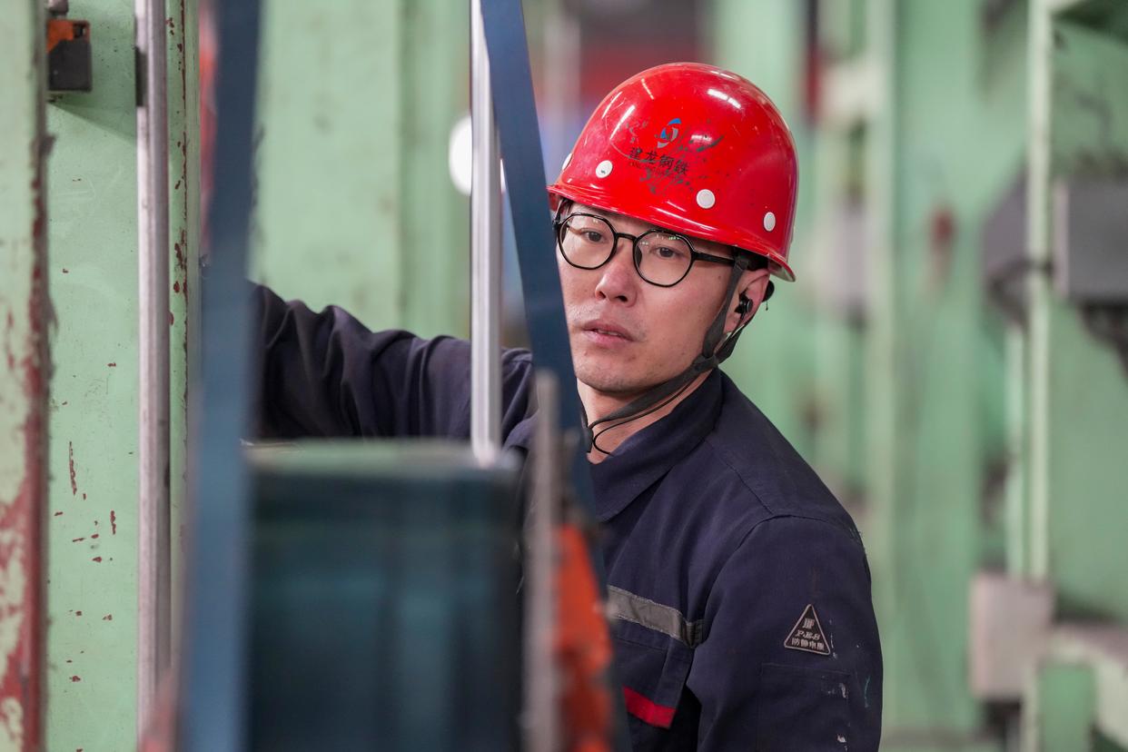 2月27日,黑龙江建龙钢铁有限公司工作人员在企业智控中心查看生产数据。新华社记者 王松 摄
