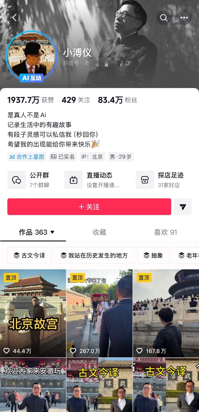 回看去年的创作,付强的视频内容多为记录路人视角下见到“溥仪”的各种反应。在故宫周边、在北京胡同,他穿着中山装走过,常有路人惊呼“太像了”,随即掏出手机。“往往要蹲拍一整天,才能得到几个合适的或者有意思的素材。”他说。流量背后,是大量的重复劳动和时间消耗。