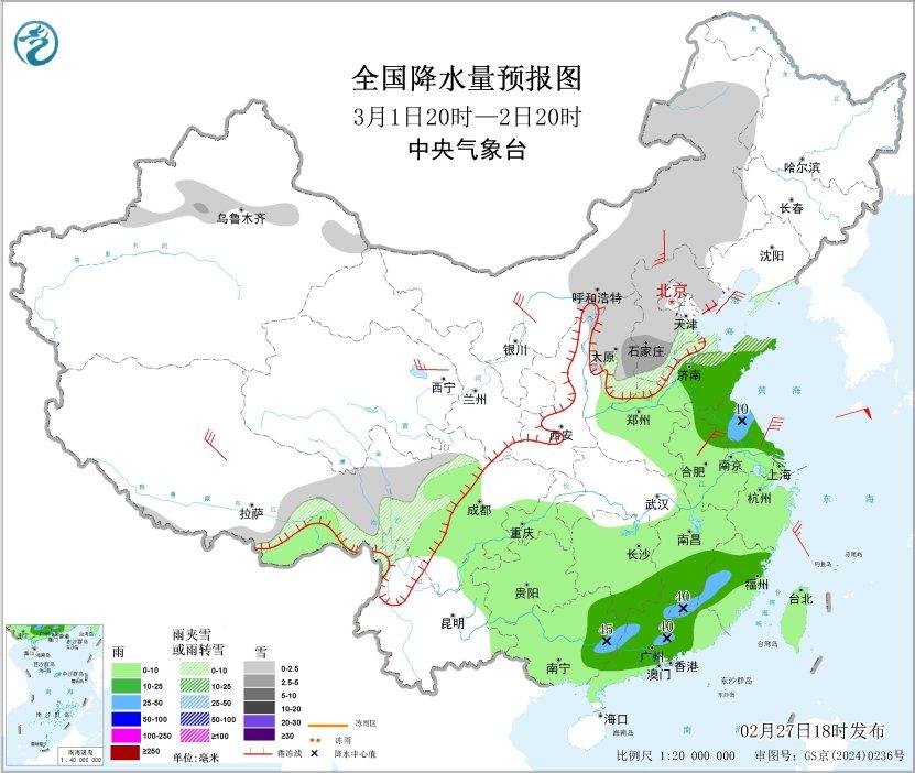 图1 全国降水量预报图(2月27日20时-28日20时)