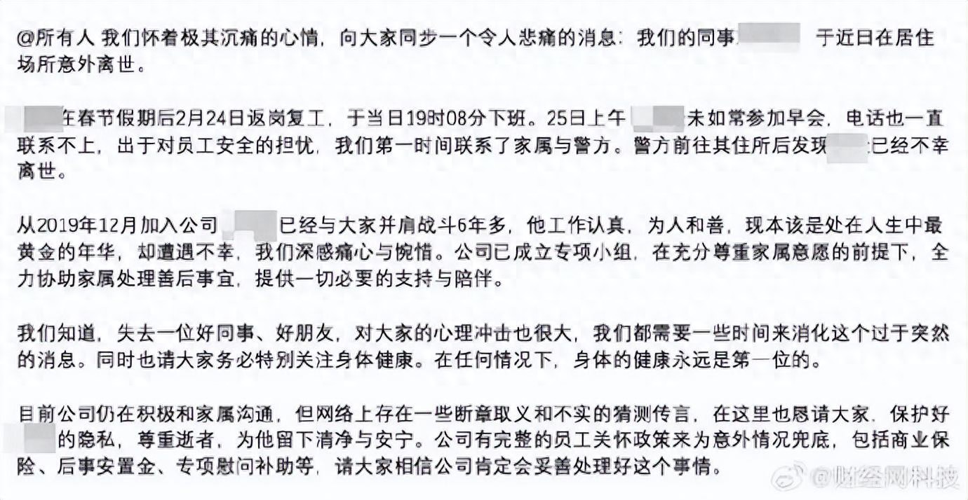 具体内容如下:我们怀着极其沉痛的心情,向大家同步一个令人悲痛的消息:我们的同事**意外离世。在春节假期后于2月24日返岗复工,当日19时08分下班。25日上午**未如常参加早会,电话也一直联系不上,出于对员工安全的担忧,我们第一时间联系了家属与警方。警方前往其住所后发现**已经不幸离世。从2019年12月加入公司已经与大家并肩战斗6年多,他工作认真,为人和善,现本该是处在人生中最黄金的年华,却遭遇不幸,我们深感痛心与惋惜。公司已成立专项小组,在充分尊重家属意愿的前提下,全力协助家属处理善后事宜,提供一切必要的支持与陪伴。