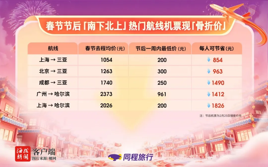 另据同程旅行2月26日数据,节后一周国内机票均价快速回落,与春节假期峰值相比几乎“腰斩”,部分热门航线机票价格降幅高达80%—90%,甚至比高铁票还便宜。上海飞哈尔滨机票从春节假期的均价2026元跌至最低200元,降幅达90%。与此同时,节后一周汕头、福州、广州、西双版纳、三亚等热门城市酒店均价也在回落,下滑幅度达30%—45%,预计这一机酒价格趋势将延续至3月底。