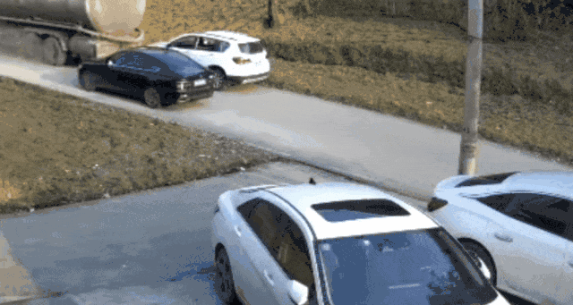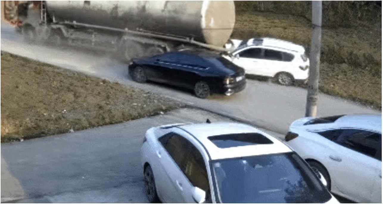 现场视频显示:黑色轿车曾试图倒车避让,然而罐车速度太快,黑车被侧翻的罐车压住尾部,停靠在路边的白色SUV遭受正面冲击,车头受损严重。