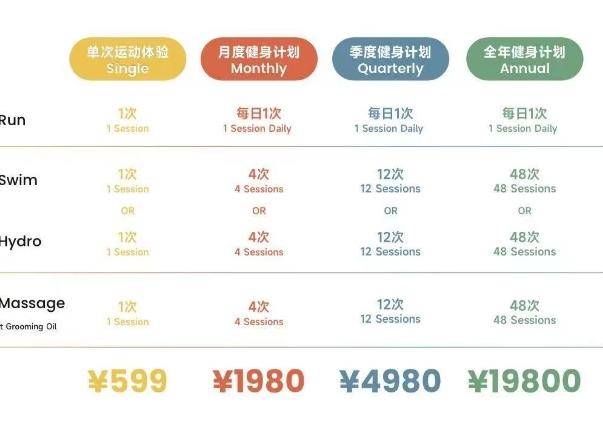 会员价目表显示,单次运动体验价格为599元,包含跑步、游泳/水疗、按摩各一次;月卡售价1980元,含每日1次跑步、4次游泳/水疗以及4次按摩;年卡售价19800元,含每日1次跑步、48次游泳/水疗以及48次按摩。