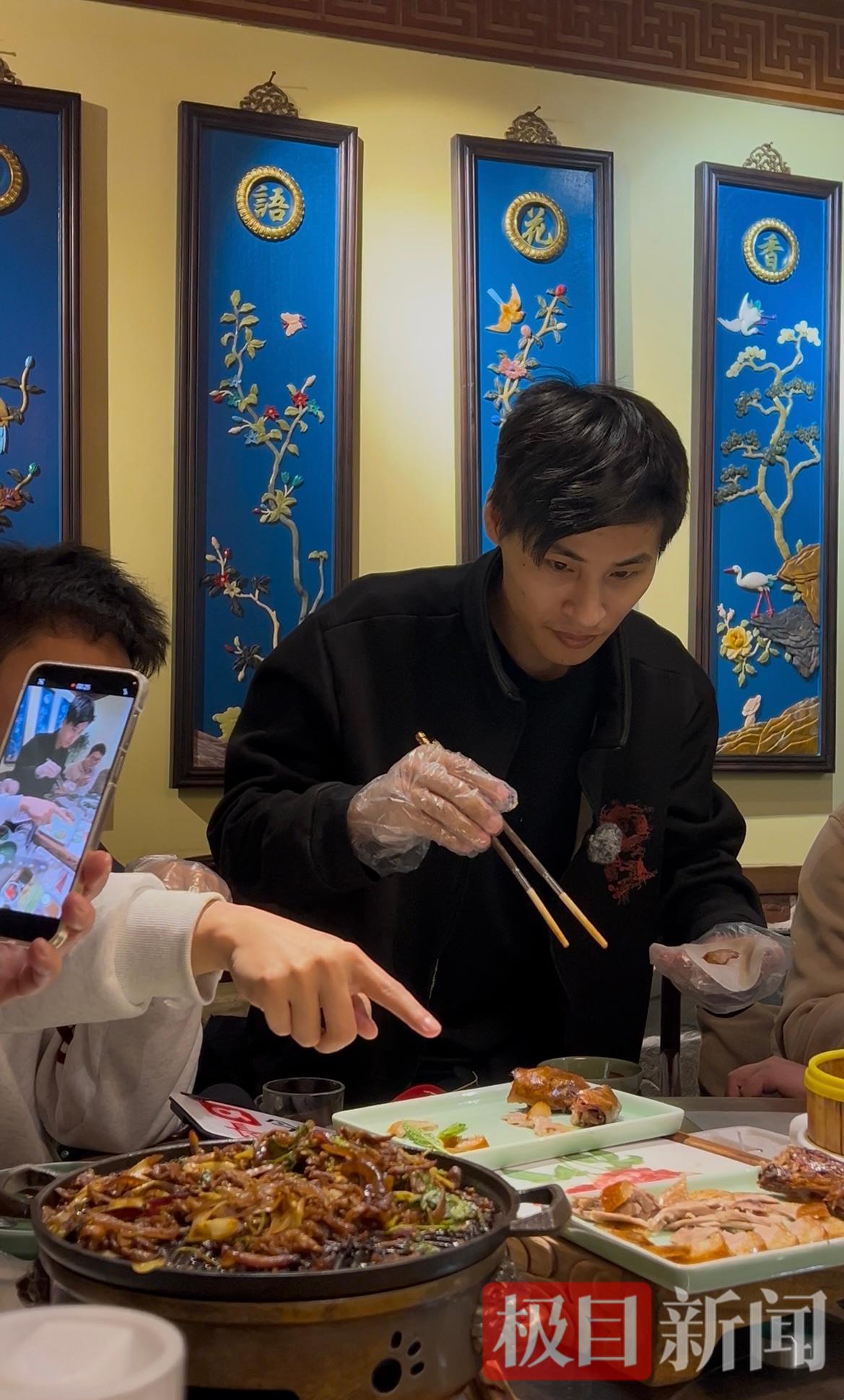 随后,张云鹏还给自己包了一个烤鸭卷。这是他第一次卷烤鸭卷,他左手拿着卷饼,右手小心翼翼地夹起烤鸭片和青菜,又加了白糖,包成一个大的烤鸭卷,一口全部放嘴里,“加了白糖更有味道!”
