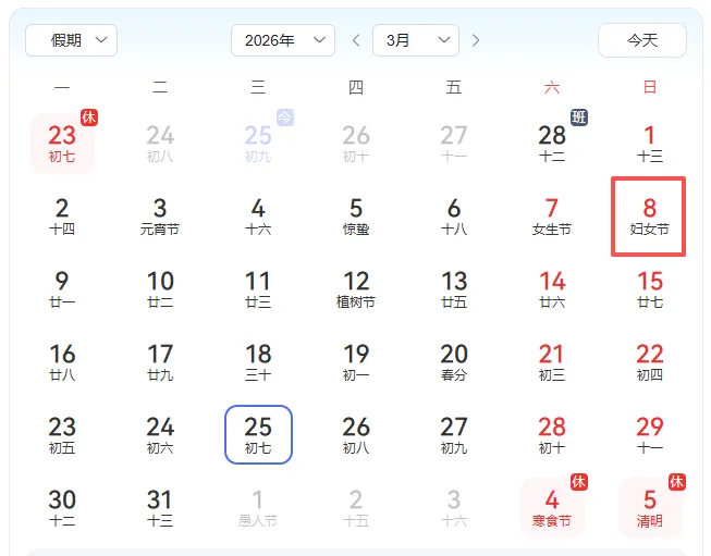 今年的3月8日在周日