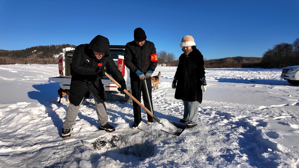 目送游客离开后,记者来到了额尔古纳河支流阿巴河。由于地下水杂质较多,生活在这里的人们需在河面凿冰取水。