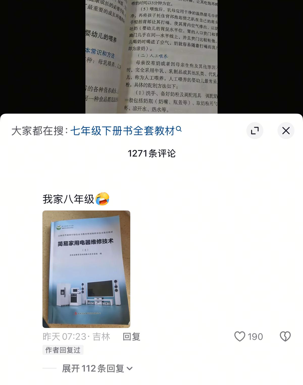 多名IP地址为吉林的网友发帖称,正在读七年级的孩子从学校领回了名为《家政服务技术》的教材。家长翻看目录发现,这本书包括家庭礼仪、家庭餐的制作、家居保洁、孕产妇护理、照料婴幼儿和病人等内容。家长表示感到新奇,引发网友的共鸣。不同的网友在评论区分别晒出了孩子收到的教材,包括《花卉栽培技术》《简易家用电器维修技术》《创业与经营管理》等。