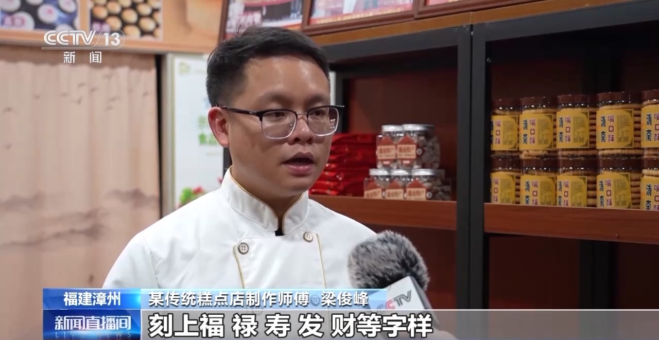 某传统糕点店制作师傅 梁俊峰:龟在传统文化中有长寿的寓意,刻上福、禄、寿、发、财等字样,用于组合成龟背的图案。从正月初五初六开始,一直持续到元宵节,订单会比较多,最多的话我们一天要生产1000斤。