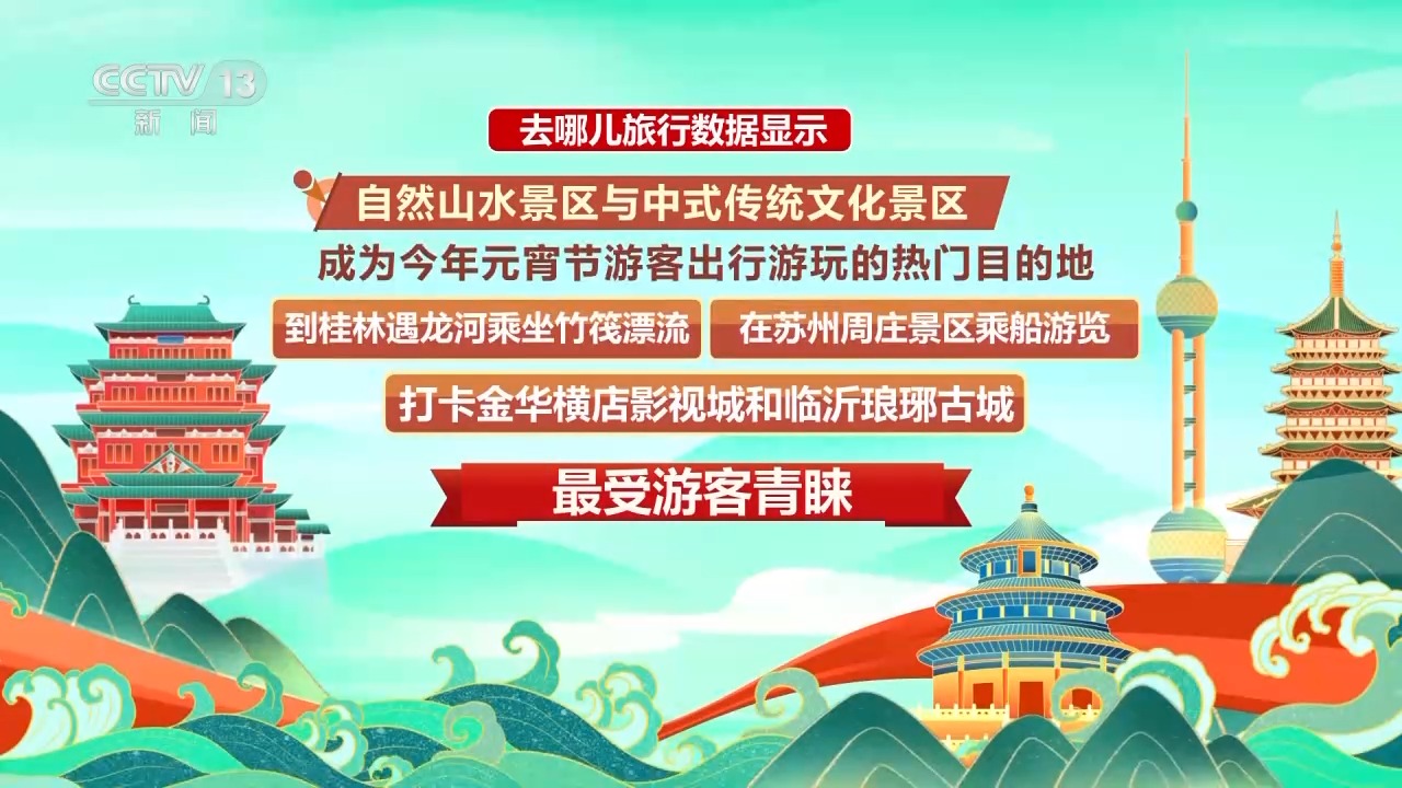 去哪儿旅行数据显示,自然山水景区与中式传统文化景区,成为今年元宵节游客出行游玩的热门目的地。到桂林遇龙河乘坐竹筏漂流、在苏州周庄景区乘船游览,打卡金华横店影视城和临沂琅琊古城,最受游客青睐。