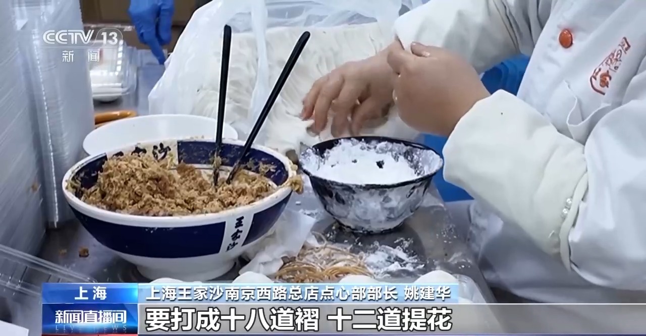 上海王家沙南京西路总店点心部部长 姚建华:都是我们师傅现场手工制作的,要打成十八道褶、十二道提花,这就是老上海味道的精髓。