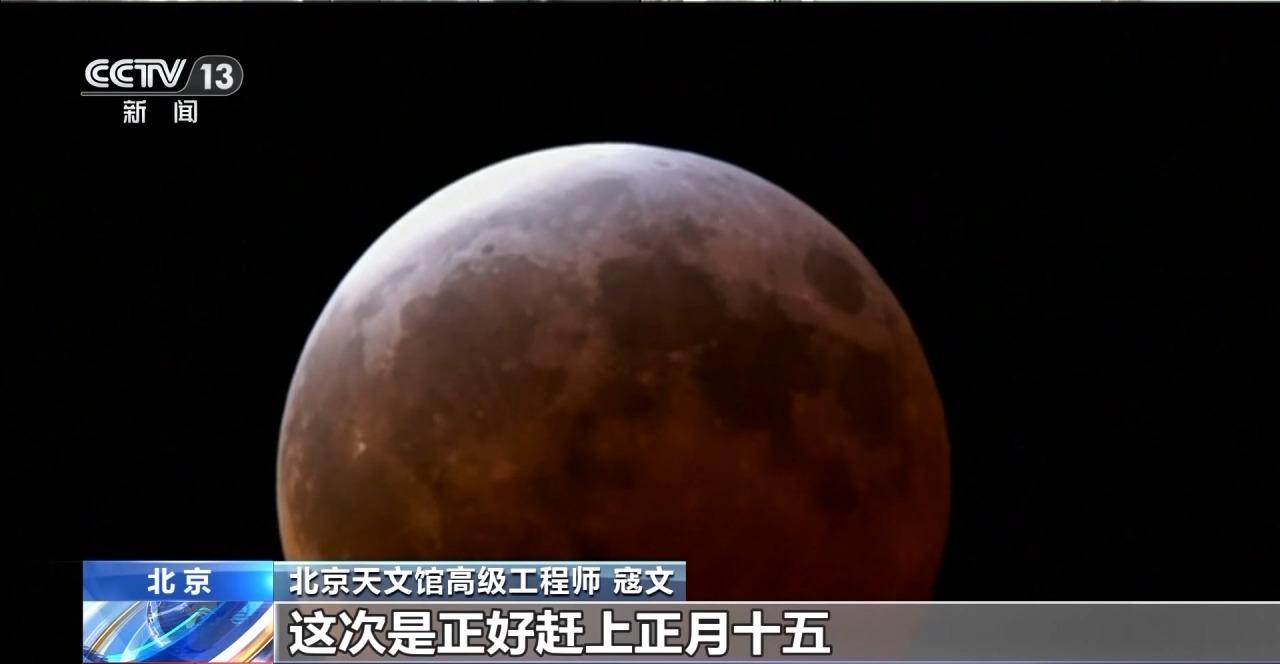 北京天文馆高级工程师 寇文:每年月食最多也就是发生3次,最少一次也没有。这次正好赶上正月十五,其实这个就尤其显得罕见了,你往前查大概2007年、2008年出现过,往后要到2054年才会再赶上一次月食发生在正月十五,但是可惜那一次咱们国家看不到,真正能够看到下一次元宵节的月全食要等到2072年。