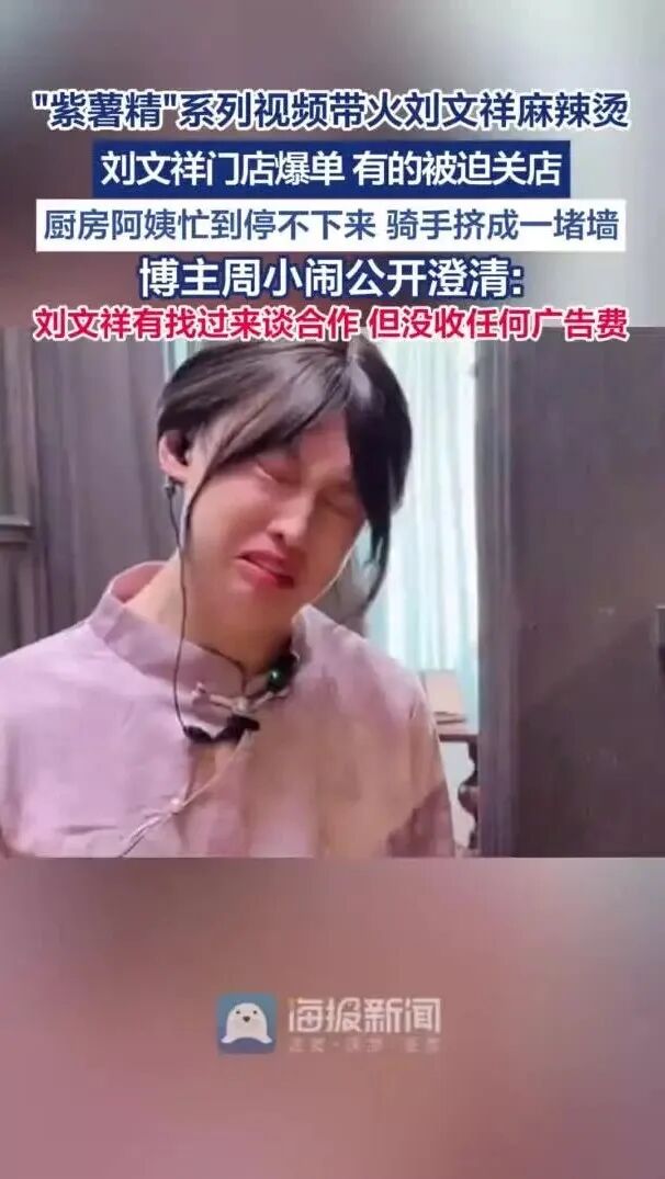 近日,短视频创作者周小闹在《饭店寒假工》系列中塑造的爆款角色“紫薯精",因魔性台词“如果全世界都指责你,我就带你去吃刘文祥”意外带火连锁麻辣烫品牌"刘文祥"。据密度新闻,不少刘文祥麻辣烫门店因“爆单”暂停营业,有网友称就连麻辣拌配料都已售罄。