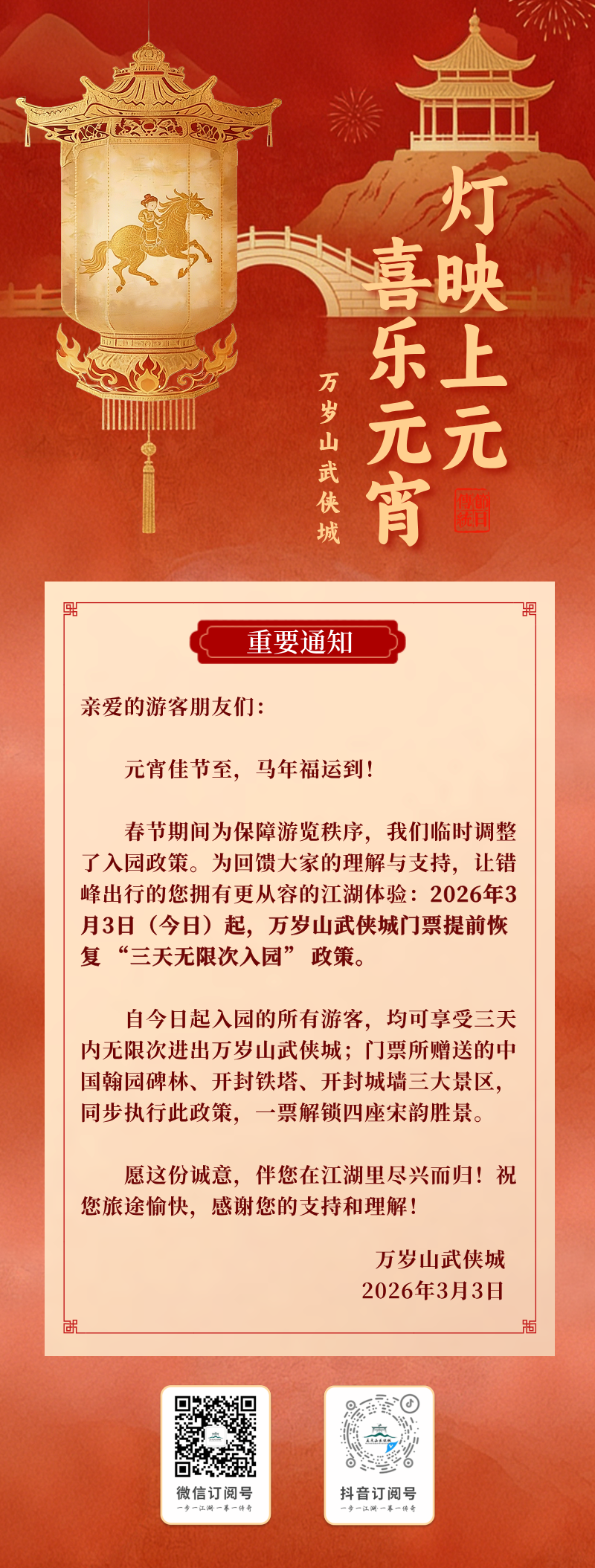 2026年3月3号,万岁山武侠城发布通知称临时调整了入园政策:2026年3月3日(今日)起,万岁山武侠城门票提前恢复“三天无限次入园”政策。