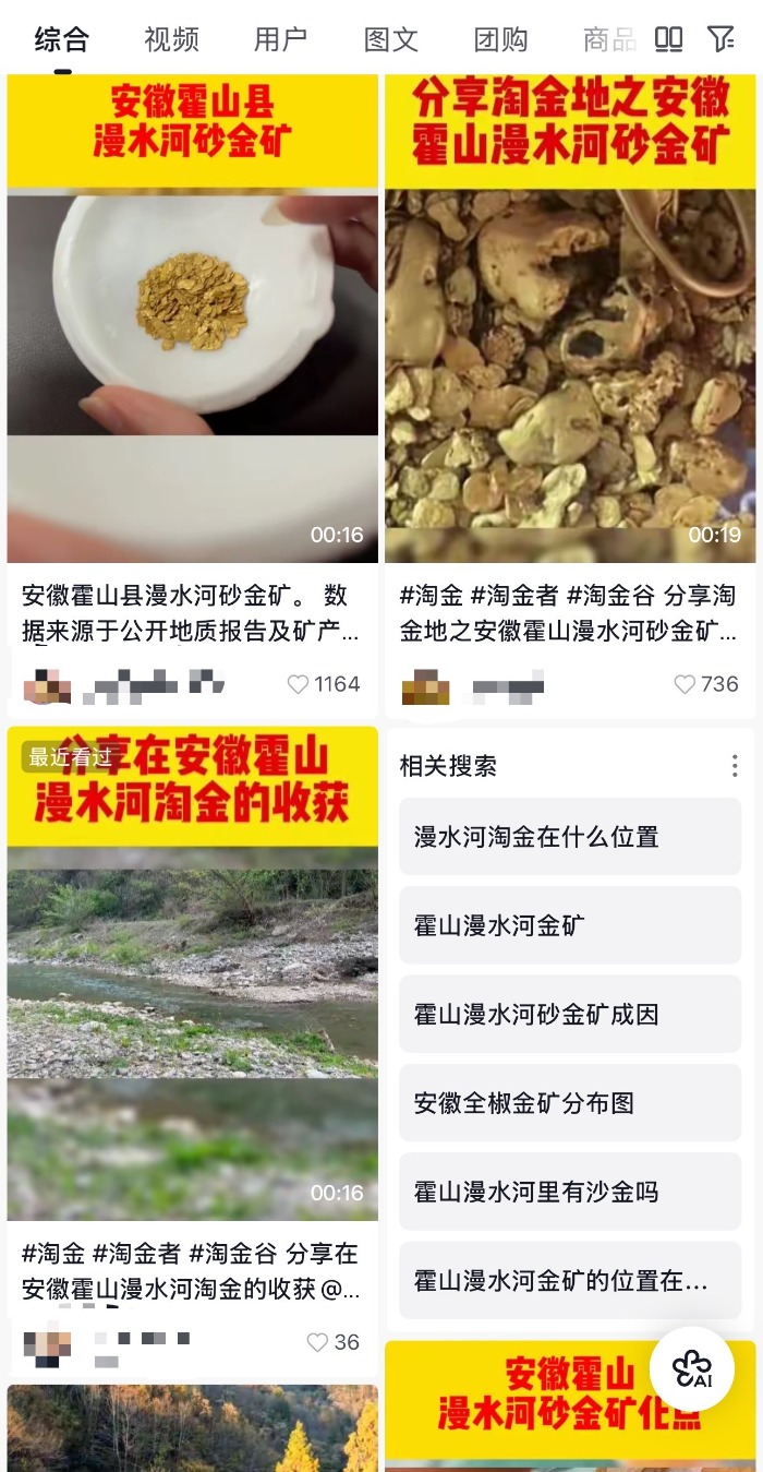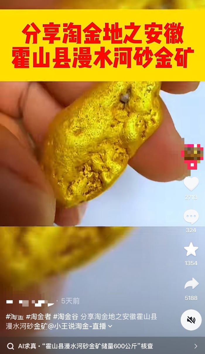 大皖新闻讯近日,多个社交账号在抖音平台发布视频,称在安徽霍山县漫水河镇“淘金”引发广泛关注。视频中言之凿凿地表示,漫水河流域拥有砂金矿,属于冲积型砂金矿,沿河分布,赋存于第四系全新统河漫滩砂砾石层中,砂层厚度1至4米,预估储量约600公斤。评论区里,不少网民纷纷留言调侃“组团去淘金”,也有网友质疑视频的真实性。