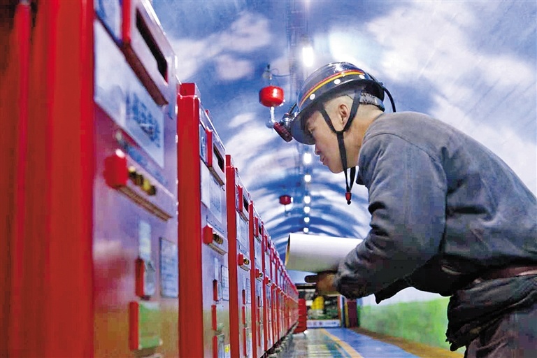 工人在井下机电硐室巡检防爆开关(贾梦怡摄)