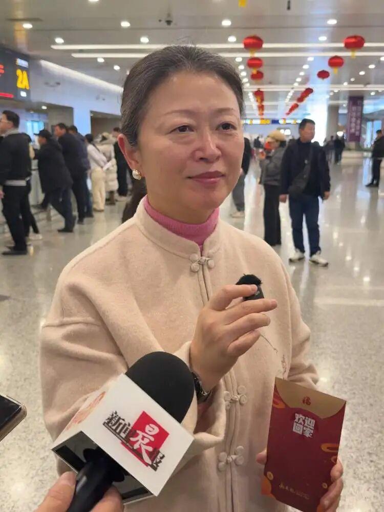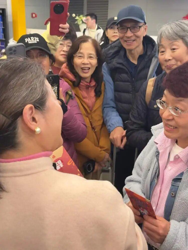 在2号航站楼2A国际到达口外,上海春秋国际旅行社(集团)有限公司董事、副总经理周卫红早早等候在现场。她手里准备着一叠红包——每个红包里放着100元打车费,上面贴着一张小标签:“欢迎回家”。