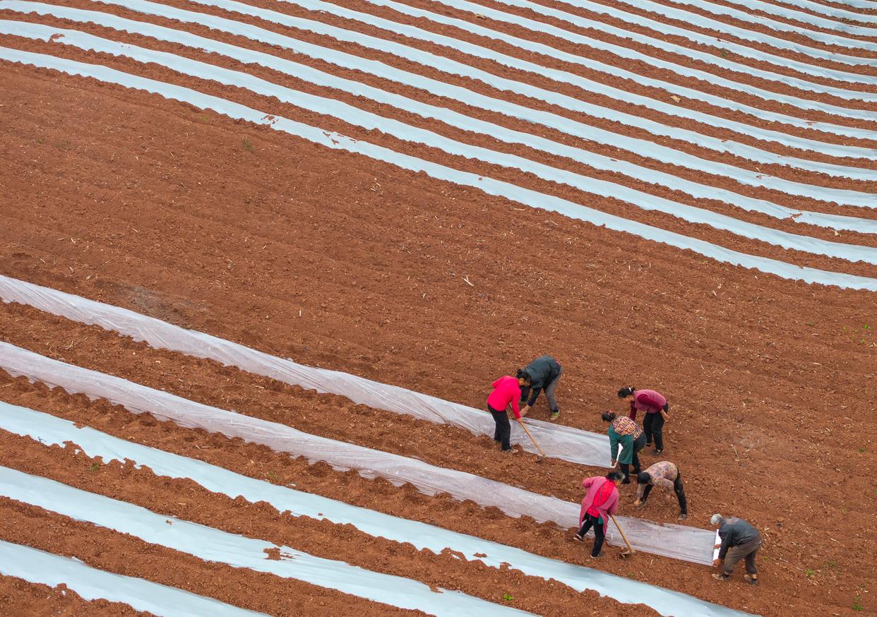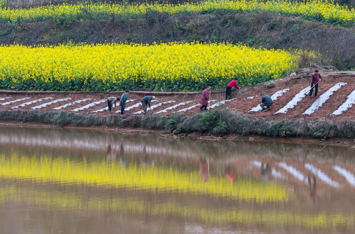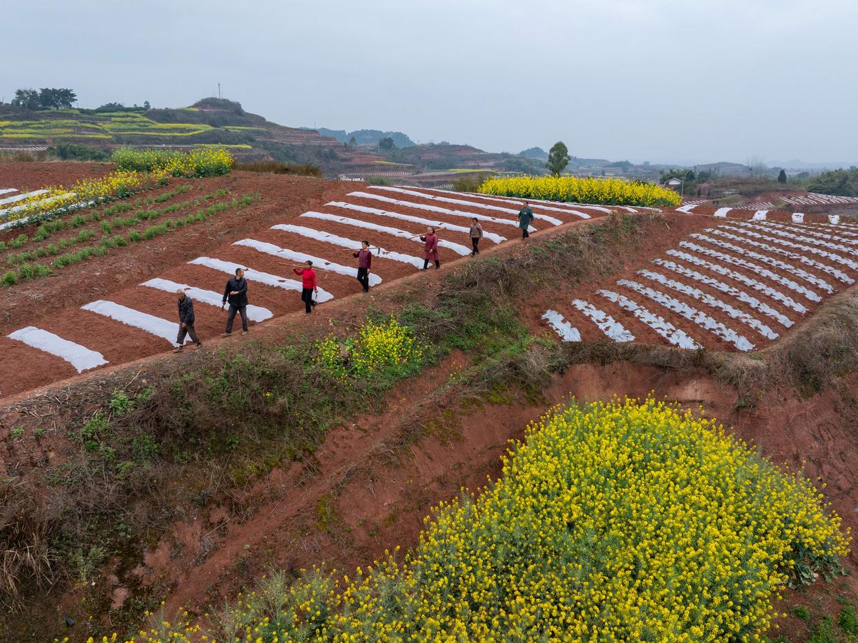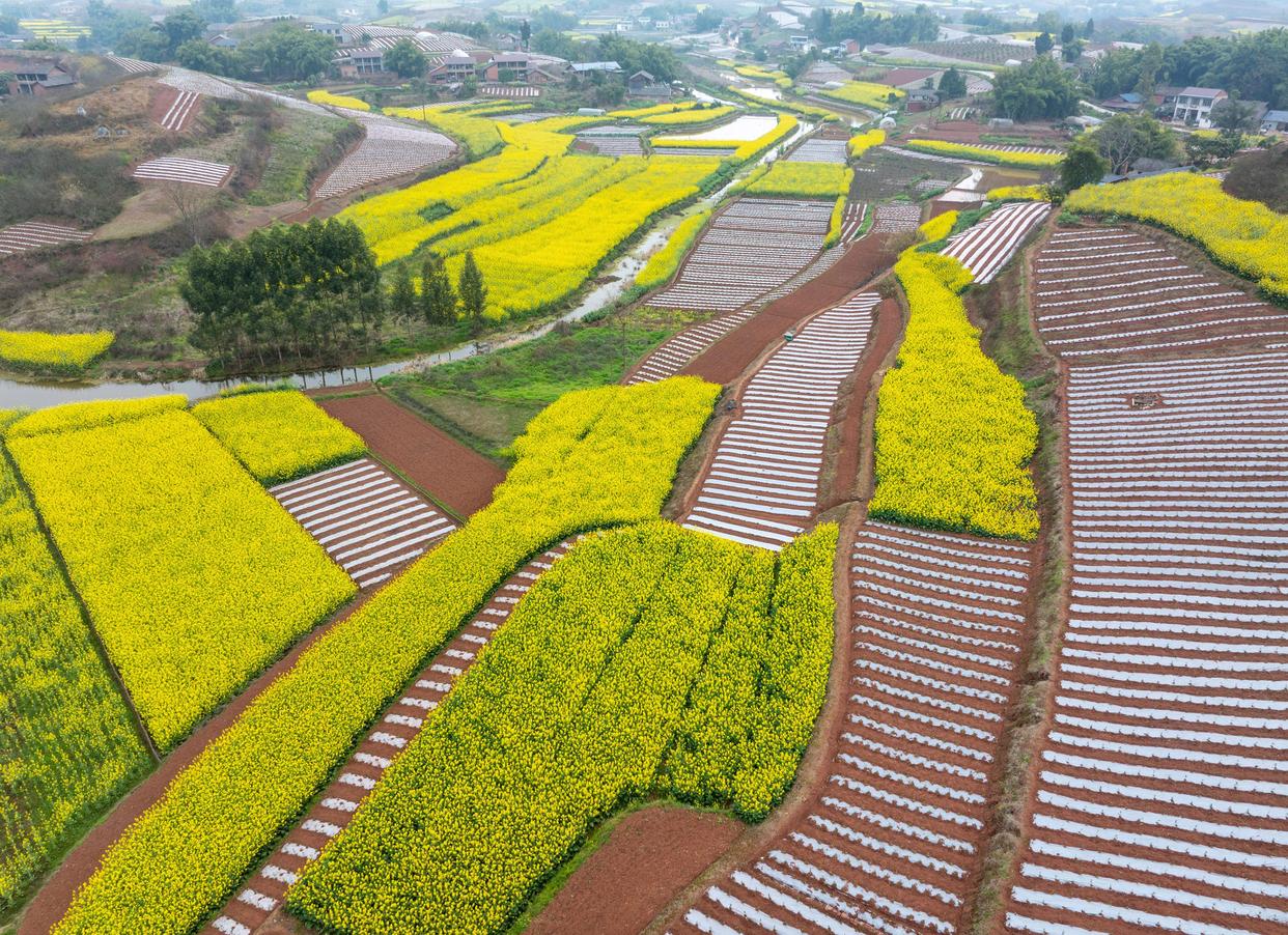 春意渐浓,四川省自贡市荣县乐德镇天宫庙村的村民开始覆地膜、种辣椒等,为春耕做准备。天宫庙村因土壤中富含铁泥质砂岩而呈赭红色,成为远近闻名的“乐德红土地”,赭红色的土壤、金黄的油菜花等形成的不同色块、线条在大地交织,形成大地的“调色板”。
