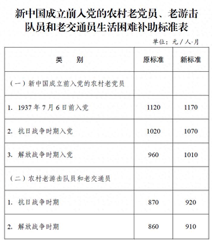 十一、对新中国成立前加入中国共产党的农村老党员和未享受离退休待遇的城镇老党员调整生活补贴标准,月补贴标准调整为:1937年7月6日前入党的,提至1170元;抗日战争时期入党的,提至1070元;解放战争时期入党的,提至1010元。