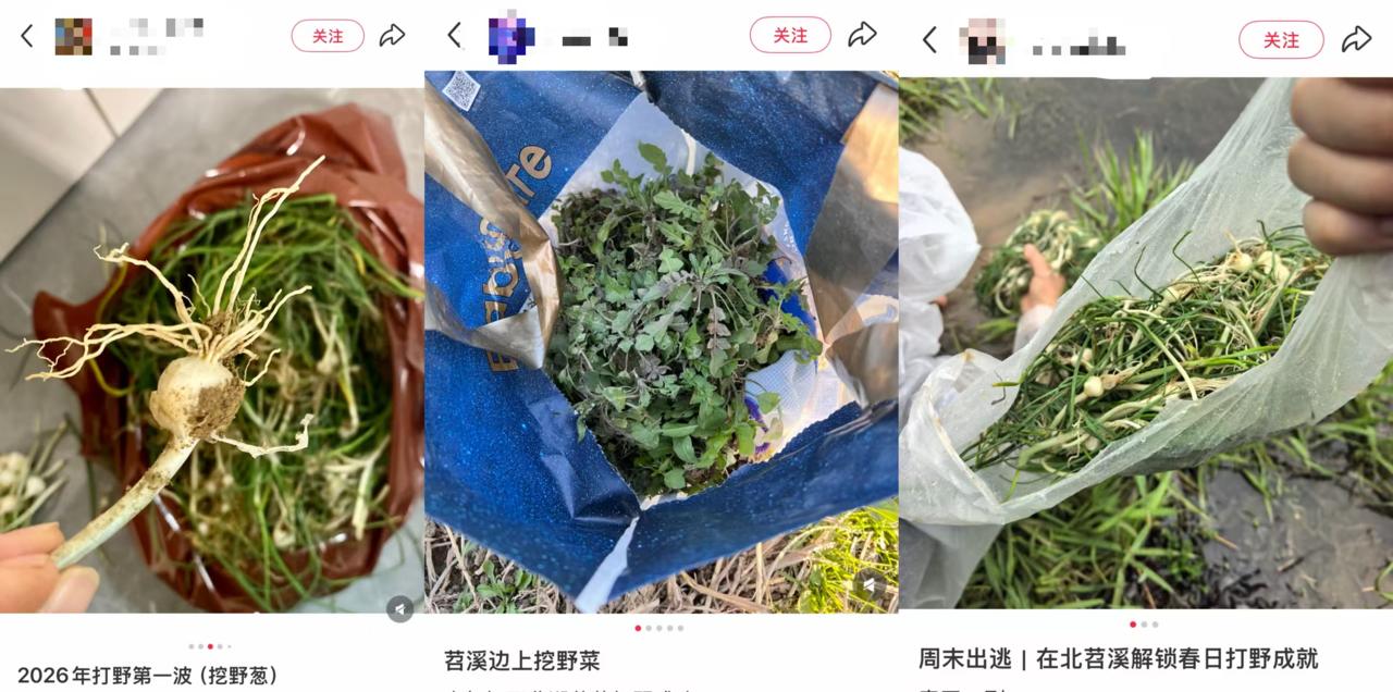 天气一晴,“打野”活跃起来。在社交平台上,有人分享城郊“打野地图”,标注荠菜、苜蓿芽的生长地点;有人记录挖野菜的治愈瞬间,分享识别野菜的实用技巧;还有人晒出“打野”装备和成果,成功组队开启“打野社交”……