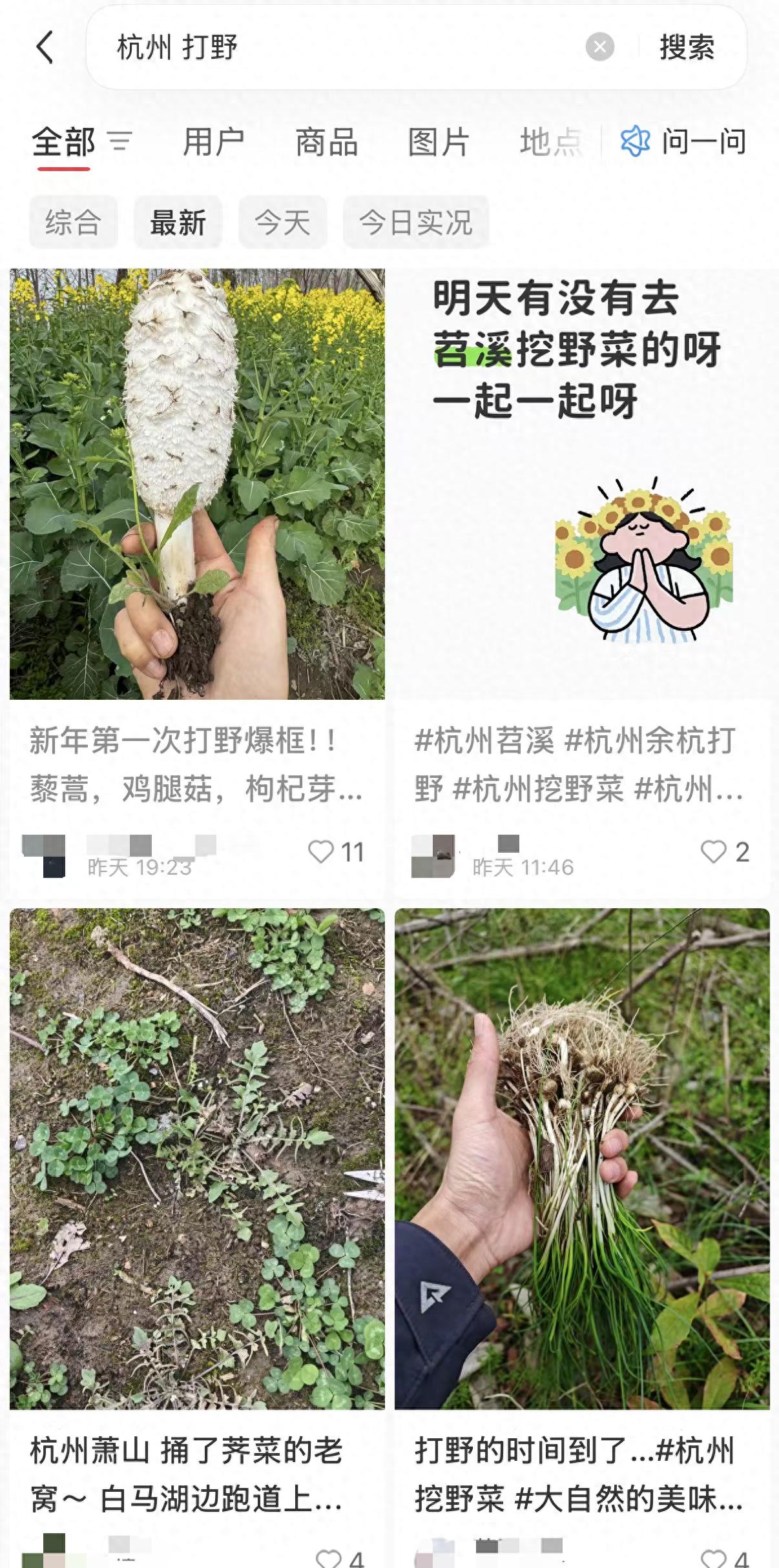 “艾草冒新绿了,马兰头、鼠曲草刚出芽”“大北苕溪、径山、龙坞、北湖草荡等地,已经藏着‘绿色宝藏’”……小花铲、园艺剪、防水手套,带上了全套打野装备,95后网友小凡紧跟着“打野小组”分享的地图,一头扎进杭州的春天里。
