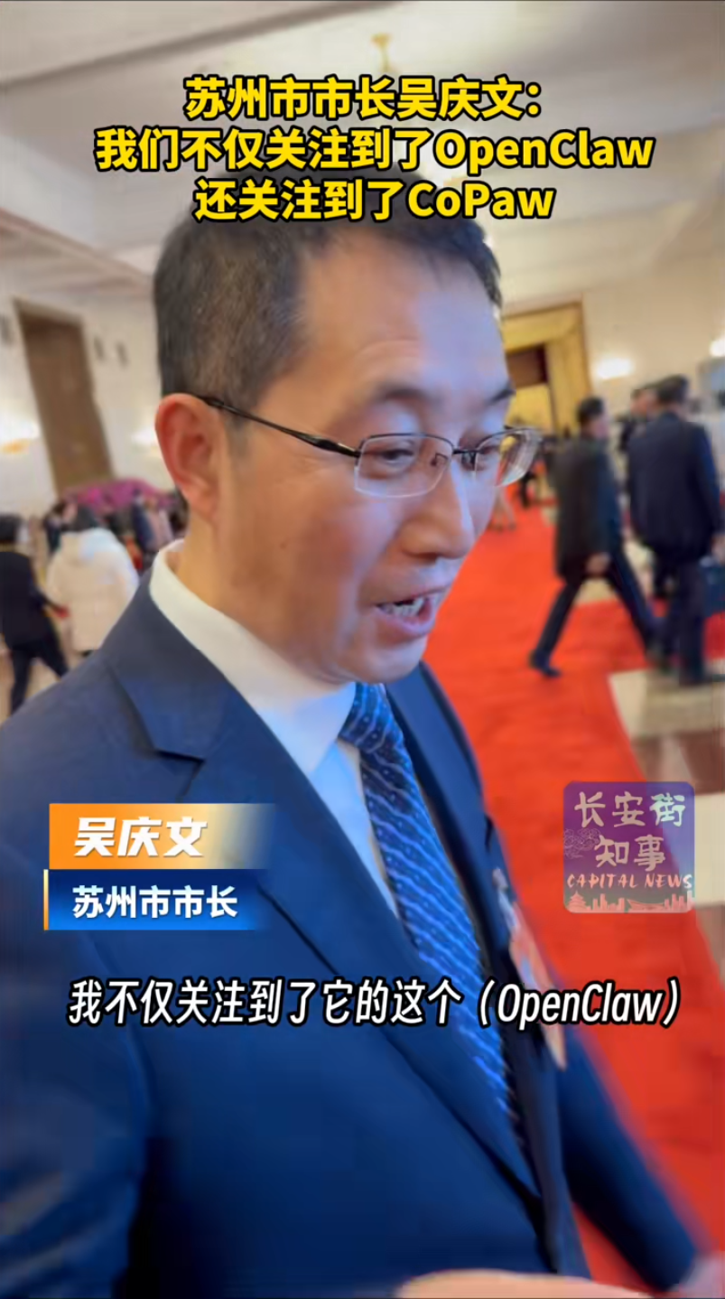 3月9日上午,全国人大代表、苏州市市长吴庆文在接受长安街知事采访时表示,已经关注到了OpenClaw,还关注到阿里巴巴也出了一款类似的智能体CoPaw。