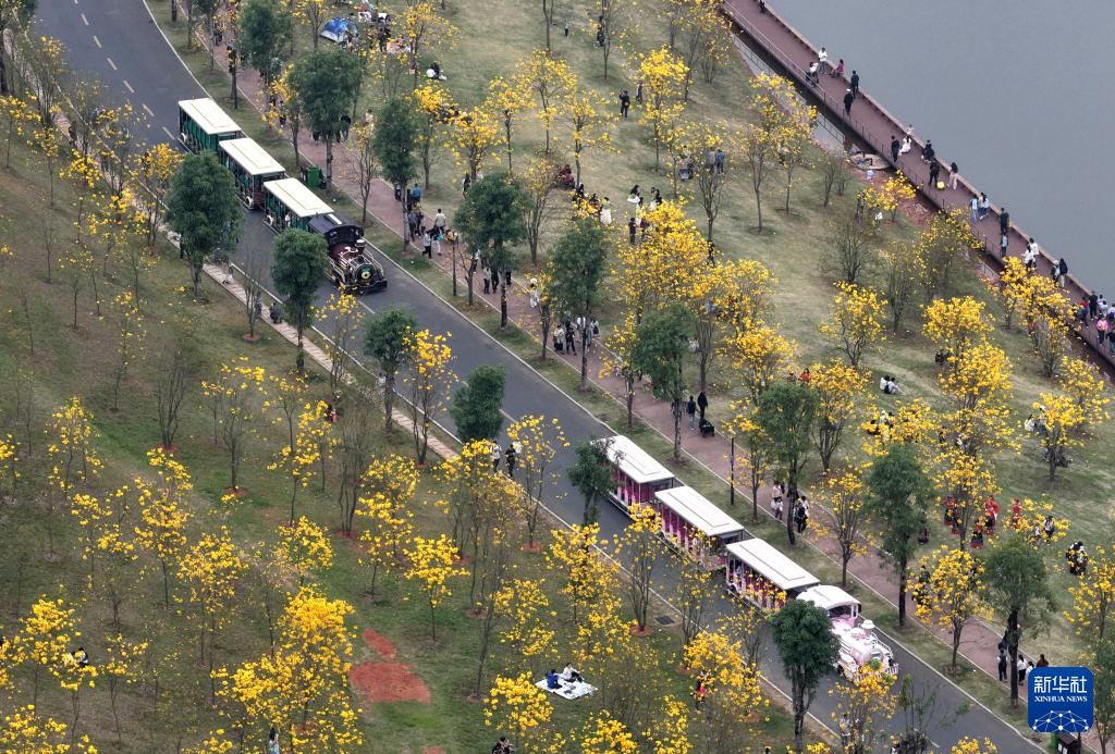 3月8日,市民在广西南宁市青秀山风景区赏花(无人机照片)。