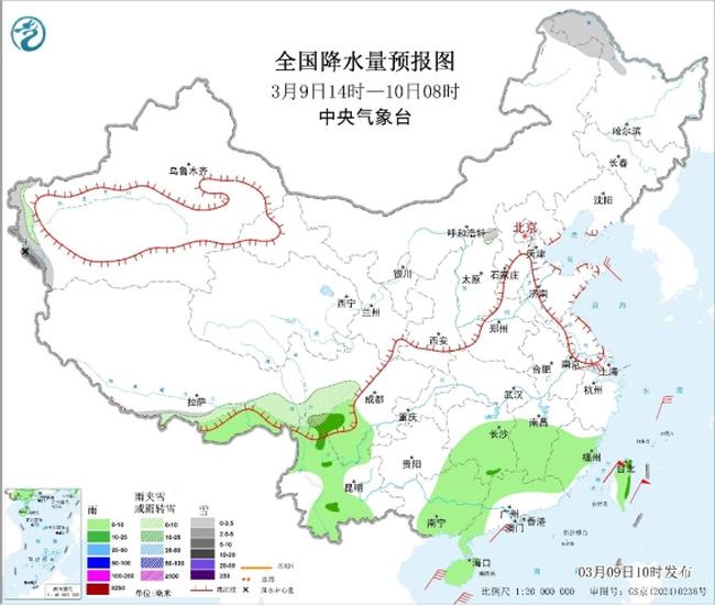图1全国降水量预报图(3月9日14时-10日08时)
